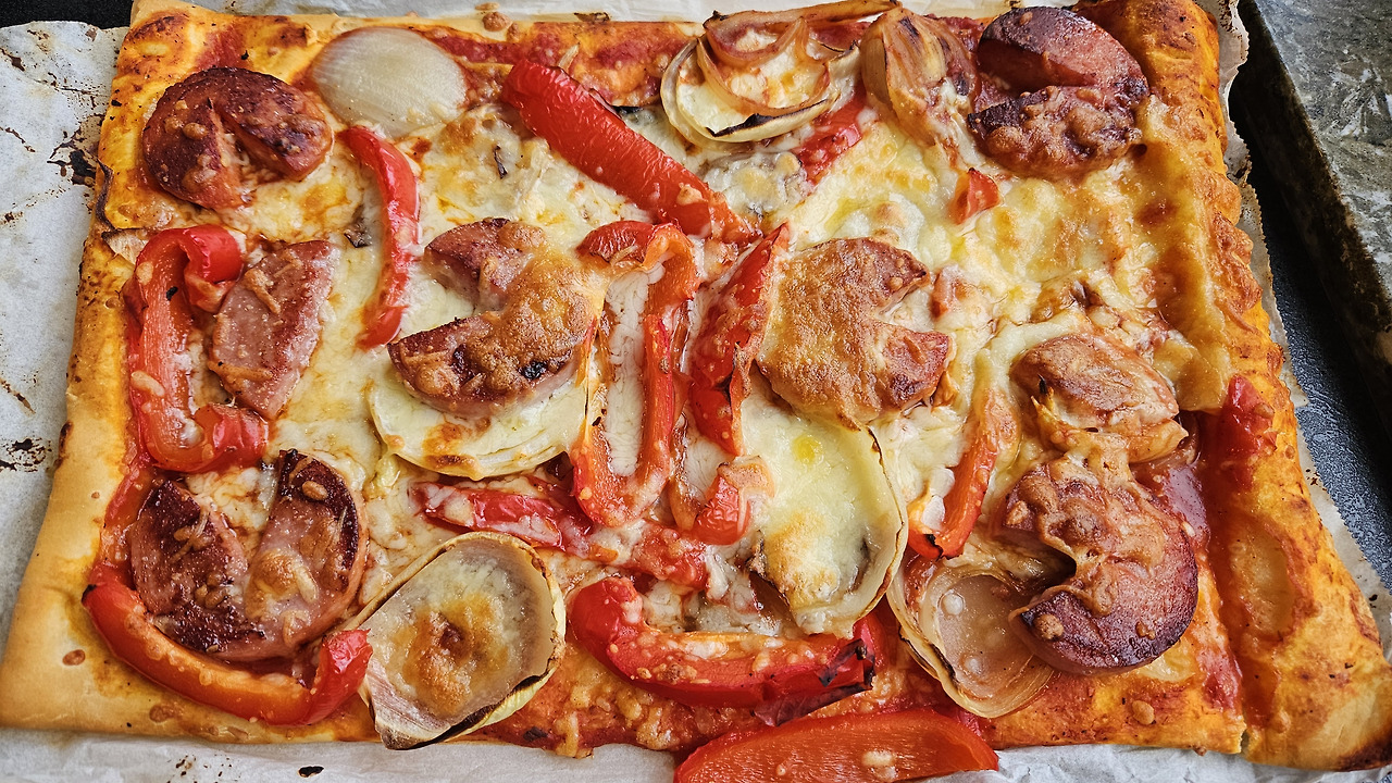 남편이 마음대로 토핑을 올려서 피자를 구웠다.
