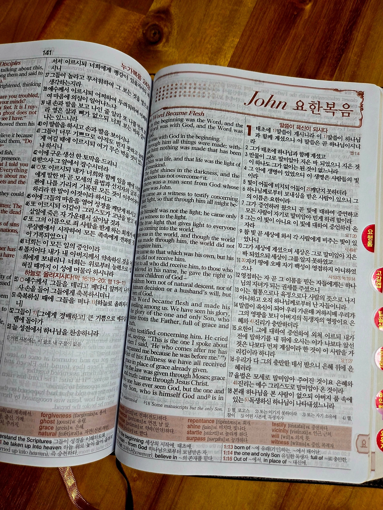 그런데요. 요즘 저는 답변이 좀 궁색해진 상황입니다. 같은 책을 계속 보고 있거든요. 바로 성경책이예요. 세상의 지식을 쌓는 일이 우선이었으니 성경책 읽는 건 늘 순서가 뒤로 갈 수 밖에 없더군요. 창세기 읽다가 놓아두고, 요한복음 펼쳐 몇 페이지 보다가 또 잊고. 이런 식이었죠.