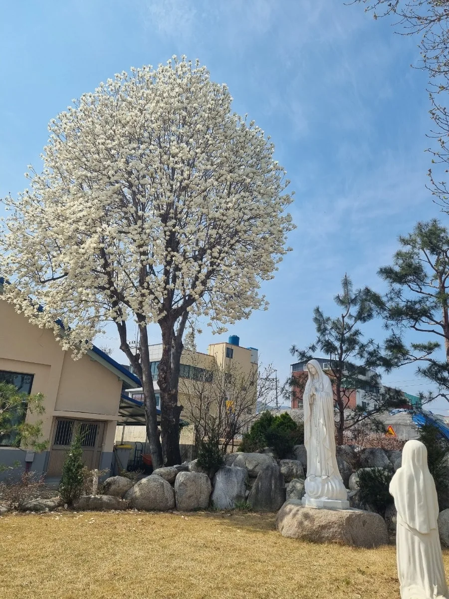 귀향했던 해 봄에 성당에 가보았습니다. 미사가 없는 월요일을 택해 방문했던지라 성당은 고요했어요. 성모상 곁에 드리워진 목련나무가 아름다웠고 신부님께서 봄볕 아래 책을 읽고 계셨어요. 사람은 인연의 수명이 다하면 떠나지만 옛날은 남는 것 같습니다. 긴 시간을 건너 이곳으로 돌아오게 된 까닭은 단지 하나는 아니겠지요. 그 이유들 가운데 달빛쌤도 있었다고 생각됩니다. 우리는 모두 집으로 가는 길 위에 있는 것 같습니다.
