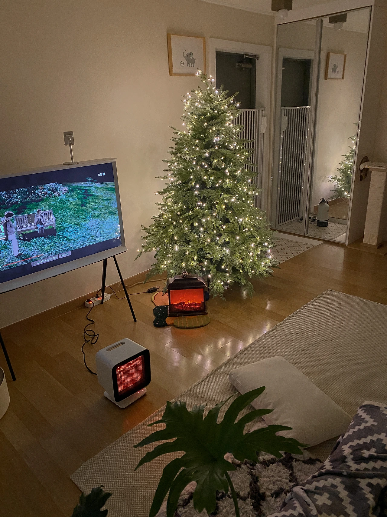 나도 모르게 탄성을 내뱉었다. 오너먼트는 안 보일 듯 보이는 유리 고드름 오너먼트로 몇 개만 달았다. 8가지의 전구 무브 중에 내가 좋아하는 건 천천히 켜졌다 꺼지는 버전. 거실의 불을 완벽하게 끄고, 깜박이는 전구를 바라보고 있으면 마치 반딧불이 수백 마리가 트리에 매달려 엉덩이 불을 깜박이는 것 같다. 토닥토닥, 마음의 위로가 됐다.