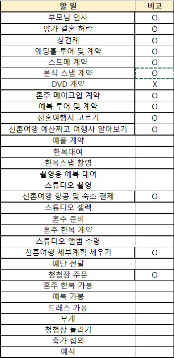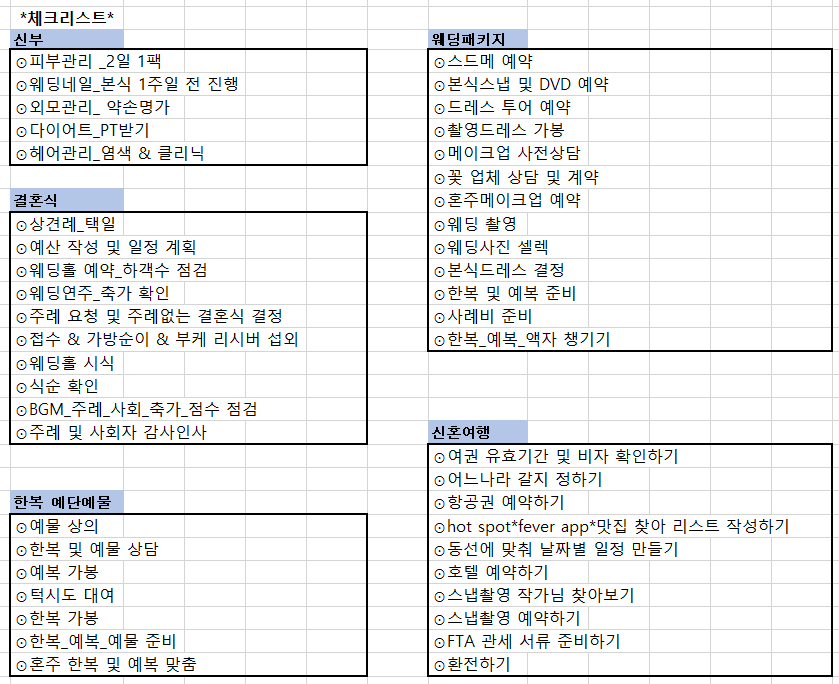 다 따라하면 끝이 없겠지만 네이버 카페를 보면 결혼 체크리스트가 있길래 저도 엑셀에 정리해 내 맘대로 하고 있습니다.