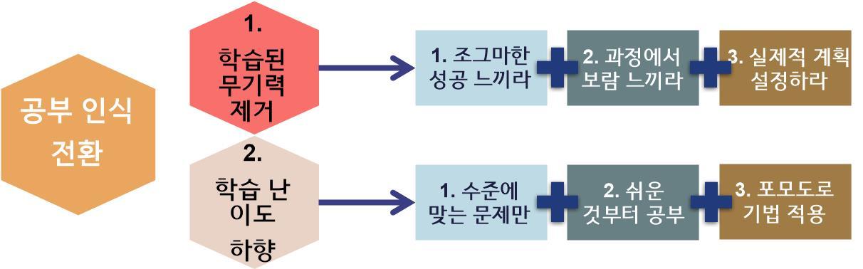 사람이 무언가에 대해 이미 갖고 있는 전반적인 감정을 바꾸는 건 쉽게 되는 일은 아니겠지요? 그러나 공부에 대한 인식을 전환하는 일에 방법이 전혀 없는 것은 아니랍니다. (ㄱ) 학습된 무기력을 제거하고, (ㄴ) 학습 난이도를 선택적으로 하향함으로써, 공부 인식을 긍정적으로 전환하는 것은 가능합니다!