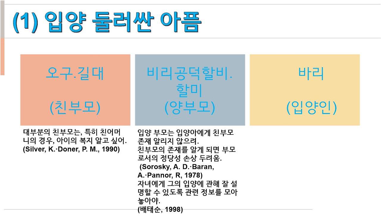 [ㄱ] 친부모의 아픔: 바리의 혈연적 친부모인 오구 대왕·길대 부인은 자신들이 버린 바리의 복지에 깊은 관심을 보인다. 물론 바리를 바다에 떠내려 보내는 길대 부인의 행동이 곧 바리를 다른 부모에게 입양시키겠다는 의도는 아니었다. 그러나 바리를 보내버린 길대 부인의 심리는 아이를 입양시킨 어머니의 심리와 밀접히 관련된다. 어떤 도승이 길대 부인에게 바리가 살아있을 것이라 말하자, 길대 부인은 “바리, 바리가 살아 있단 말입니까?”라고 말하며 놀란다. 이후에는 “바리! 내 일곱째 딸 바리야. 너만 있다면! 너만 볼 수 있다면!”이라 말하며 애도를 표한다. 사실, 대부분의 친부모는, 특히 친어머니의 경우, 자신이 포기하였으나 혈연적 관계를 맺은 아이의 복지에 대해 알고 싶어 한다. (Silver, K.·Doner, P. M., 1990) 길대 부인 역시 바리의 친어머니로서 이러한 심리를 보인다. 오구 대왕도 물론 바리를 죽이라고 지시한 것은 사실이나, 친자식인 바리와 재회하자, “바리데기를 부여잡고 서로 목을 부녀간에 목을 잡고 방성통공 설리 운다.”