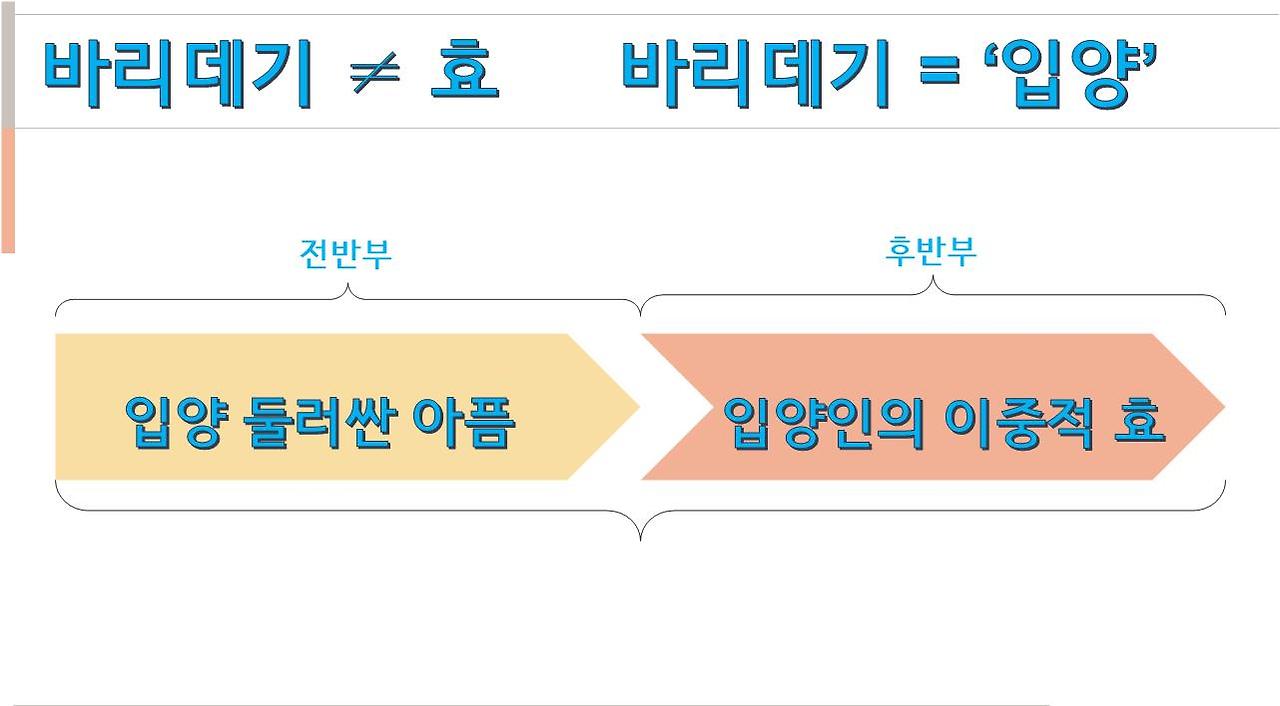 주변에서 입양과 관련하여 수많은 가슴 미어지는 이야기를 듣게 된다. 자신이 낳은 아이를 입양 보낸 친부모의 죄책감, 입양한 아이가 성장함에 따라 여러 문제를 마주하는 양부모의 혼란, 친부모와 양부모 사이에서 입양인의 당혹감…. 우리는 이들의 아픔에 주목할 수 있어야 한다. 이와 관련하여, 한국에서 전국적으로 오래전부터 전승되어온 「바리데기」 신화는 친부모, 양부모, 입양인이 느끼는 고통을 생생히 드러낸다. 더욱이, 입양인인 바리공주가 친부모와 양부모 사이에서 어떠한 방식으로 효(孝)를 실천하는지를 보여준다.