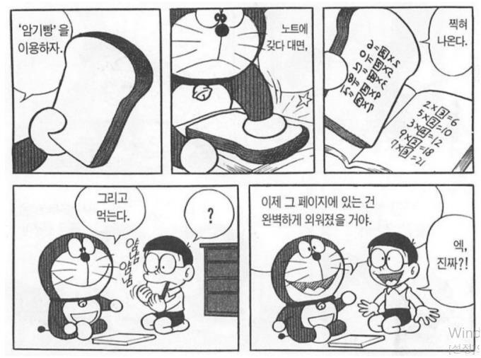 만화 도라에몽에서는 '암기빵'이란 도구가 등장합니다. 이 빵을 노트에 갖다 댄 후 그 빵을 먹으면 노트에 있던 내용이 완벽하게 외워지지요. 이러한 암기빵에는 우리 학생들의 바람과 소원이 담겨 있는 게 아닐까요? 책에 있는 내용들이 쉽사리 머릿속에 암기가 되기를 간절히 바라는 겁니다. 당신도 이러한 암기빵 하나 구워 먹고 싶지 않나요?