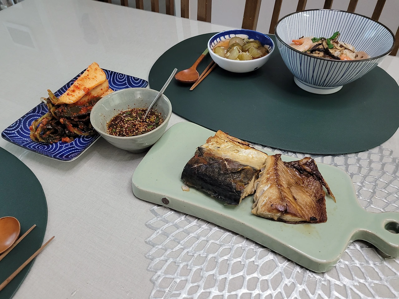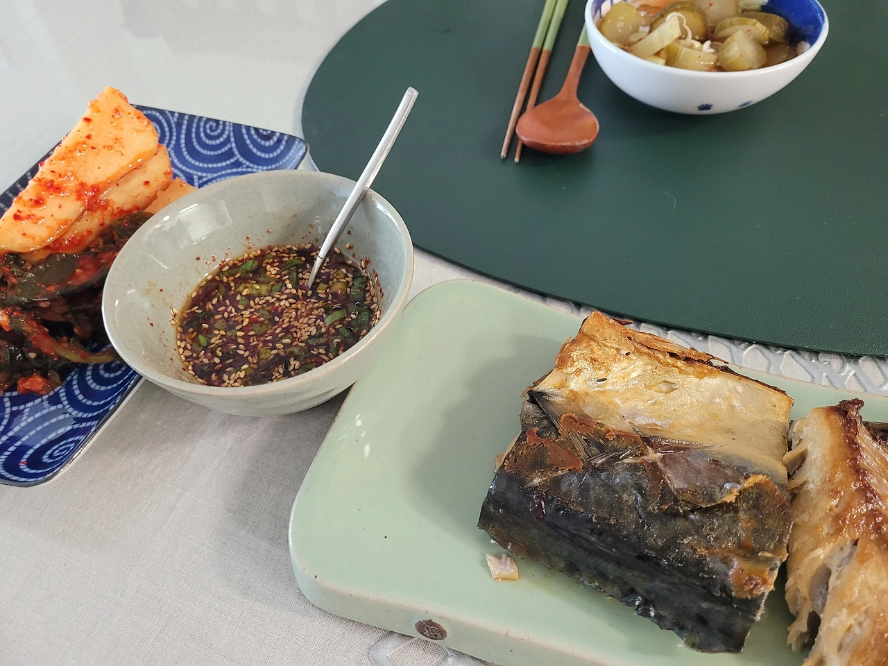 밥이 완성되고, 고등어를 굽고, 총각김치가 나왔다.