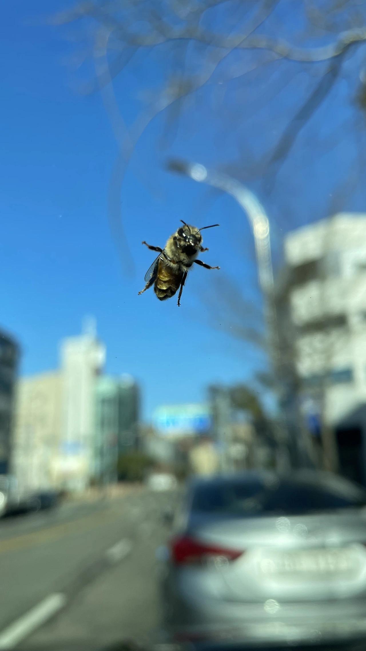 뜻밖의 손님처럼 한 마리 벌이 자동차 앞 유리 위에 내려앉았다.