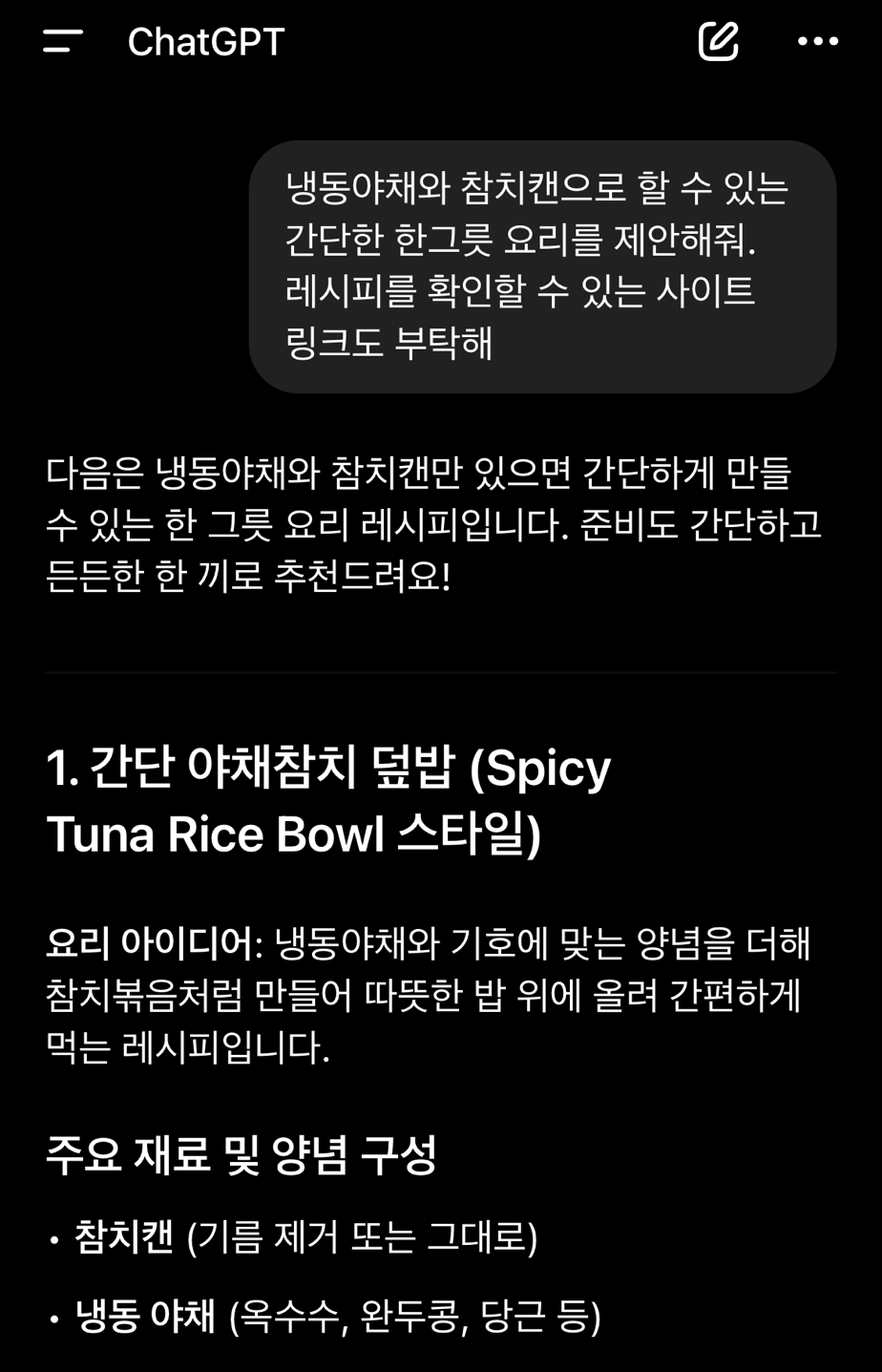 만약 요리가 어렵거나 냉장고 재료 소진이 어려운 분들에게는 챗gpt를 적극 활용하라고 권장하고 싶다. 우리 집 냉장고에 어떤 어떤 재료가 있고, 이 재료를 소진할 수 있는 집밥 레시피를 실제 참고할 수 있는 레시피 링크와 함께 전달 달라고 요청하면 챗 gpt에게 금방 현명한 답을 받을 수 있다.