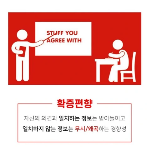 조직생활을 하다 보면 한 번쯤 다수의 의견에 반하는 생각 또는 틀린 주장을 강력하게 피력하는 사람들을 만나본 경험이 있을 텐데, 그게 클라이언트든 상사든 본인의 하루를 망치는데 지대한 공헌을 한다. 특히 그들이 경험이 부족하거나 업무를 대하는 태도가 미숙하다면, 재앙을 부르는 판단을 하게 될 수 도 있다. 이런 상황을 마주하게 만드는 이유 중 하나는 확증편향 (Confirmation Bias)을 들 수 있다. 확증편향이란 보고 싶고 듣고 싶고 믿고 싶은 정보만 받아들이는 인간의 오류를 뜻한다. 보수적이거나 작은 성공을 스스로 크게 받아들여 병적으로 사로잡혀 있는 사람이 있는 조직의 경우 평소 이런 오류를 범하곤 한다.