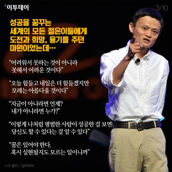 과연 그는 이런 말을 할 자격이 있을까? 시작은 초라했다. 1999년, 17명의 친구들과 알리바바를 창업 하였지만 단 한건의 거래도 성사시키지 못하였지만 2000년 소프트뱅크의 손정의 회장에게 2000만 달러를 투자 받으며 B2B 온라인 쇼핑몰의 이미지를 굳혀가기 시작했다.