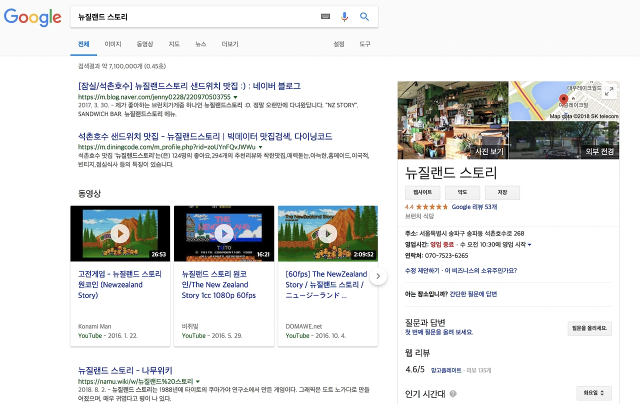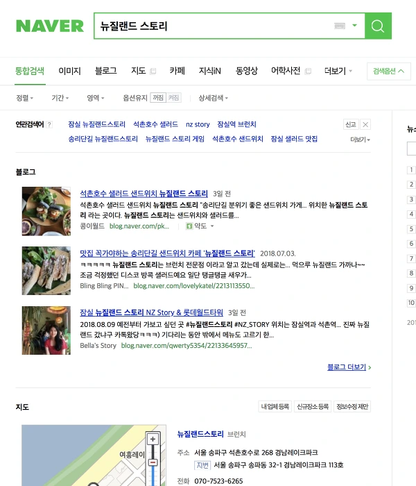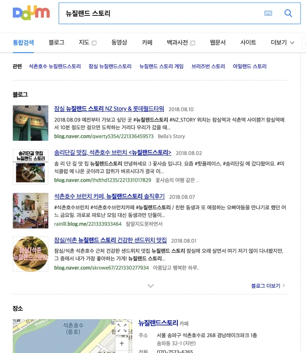 검색엔진 (구글, 네이버, 다음)에서 '뉴질랜드 스토리'를 검색한 결과 화면
