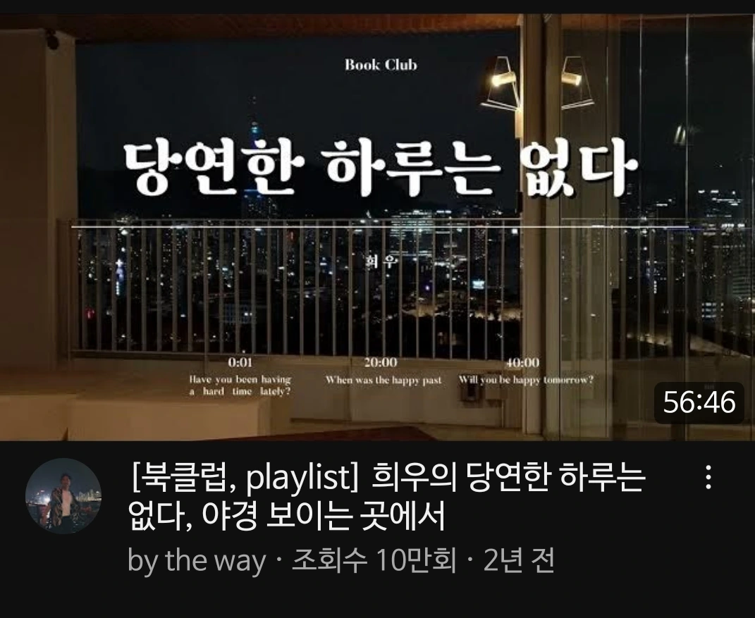 그래서 이번엔 음악에 이 책을 꾹꾹 담았다. 유튜브 '당연한 하루는 없다.'라는 플리를 반복해서 들었다. 그래서 책 내용이 크게 내 맘에 들지 않았더라도 이번에는 책과 음악을 동기화해서 꾹꾹 눌러 담는 경험을 해서 좋았다.