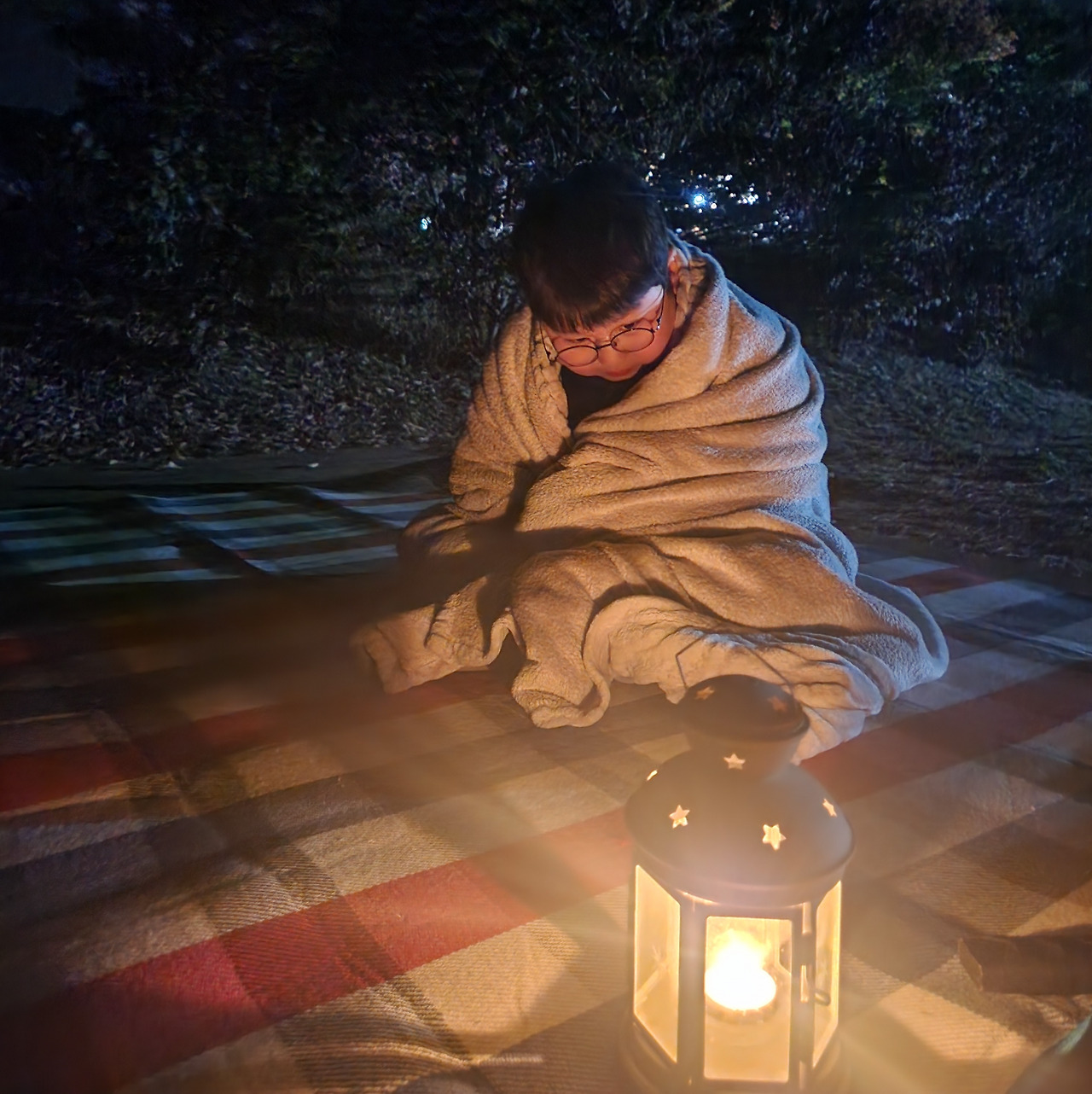 우리 두 사람의 달밤체조 현장. 줄넘기와 돗자리, 담요와 촛불만 준비하면 된다.
