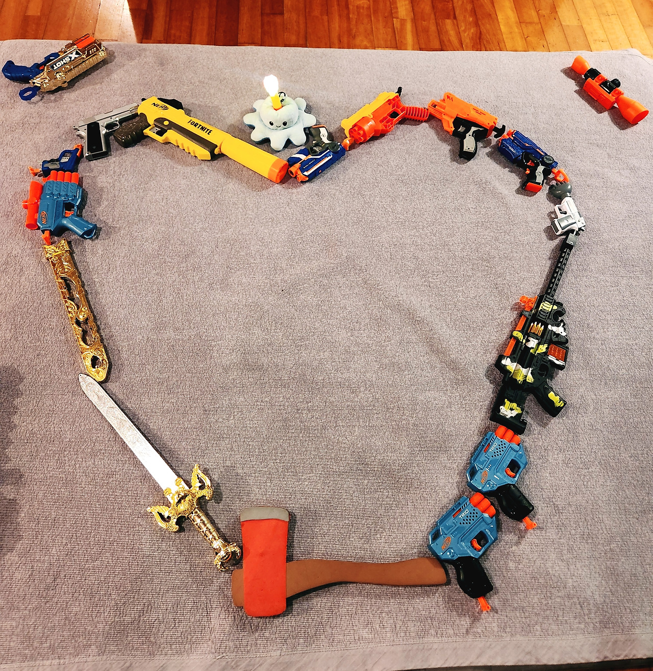 장난감 총과 칼로 만들어진 하트