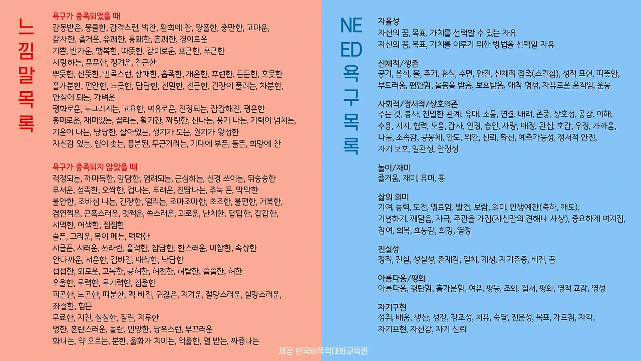 오늘 아침, 나의 감정은 단순히 좋다, 별로다, 나쁘다 정도로 표현하기는 어렵다. 그런데 막상 그 순간의 감정을 단어로 표현해 보라고 하면 쉽지 않다. 평소 느낌을 표현하는 어휘를 다양하게 쓰지 않기 때문이다. 느낌을 표현하는 낱말은 제법 많다. 다양한 감정 상태를 분명하고 명확하게 표현하는 법을 연습하면 내 감정을 편안히 바라보고 다룰 수 있게 된다. <비폭력대화>의 창시자 마셜 B. 로젠버그가 제시하는 느낌말과 욕구말 표가 있다. 욕구가 충족되었을 때와 충족되지 않았을 때 느낌을 나타내는 말이 꽤 많다. 소리 내어 읽어보자. 나의 감정을 느낌말과 욕구말로 어떻게 표현할 수 있을지 골라보자.