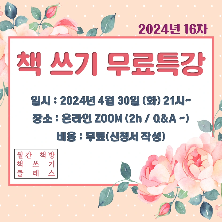일시 : 2024년 4월 30일 화요일 21시~ 장소 : 온라인 줌 (단톡방에 링크 공유) 비용 : 무료