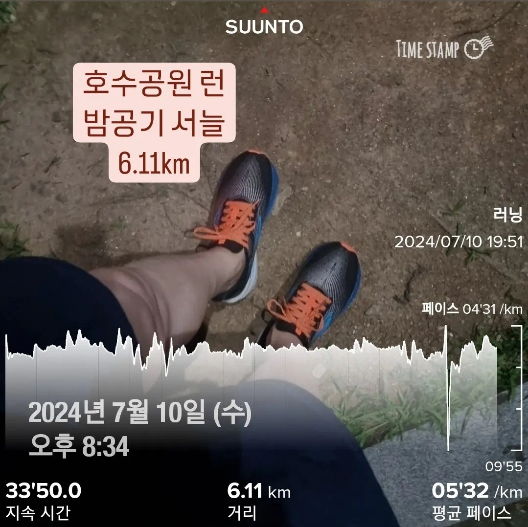 해가 진 호수 공원에는 낮 동안 열기는 오간데 없었다. 달리기 좋았고 걷기에도 그만이었다. 너무 좋았던 걸까? 스마트워치가 알려주는 속도가 생각보다 빨랐다. 이참에 실험해 보고 싶었다. 이전보다 속도를 올리면 얼마나 달릴 수 있는지를. 4킬로미터까지는 무난하게 뛰었다. 이때부터 서서히 배가 아팠다. 10킬로미터를 목표로 정했지만 6킬로 지점에서 멈췄다. 한 번 아프기 시작한 배는 달리는 동안에는 나아지지 않는다. 그래서 몸상태에 맞는 속도를 유지해야 한다. 과욕은 원하는 결과를 얻지 못한다.