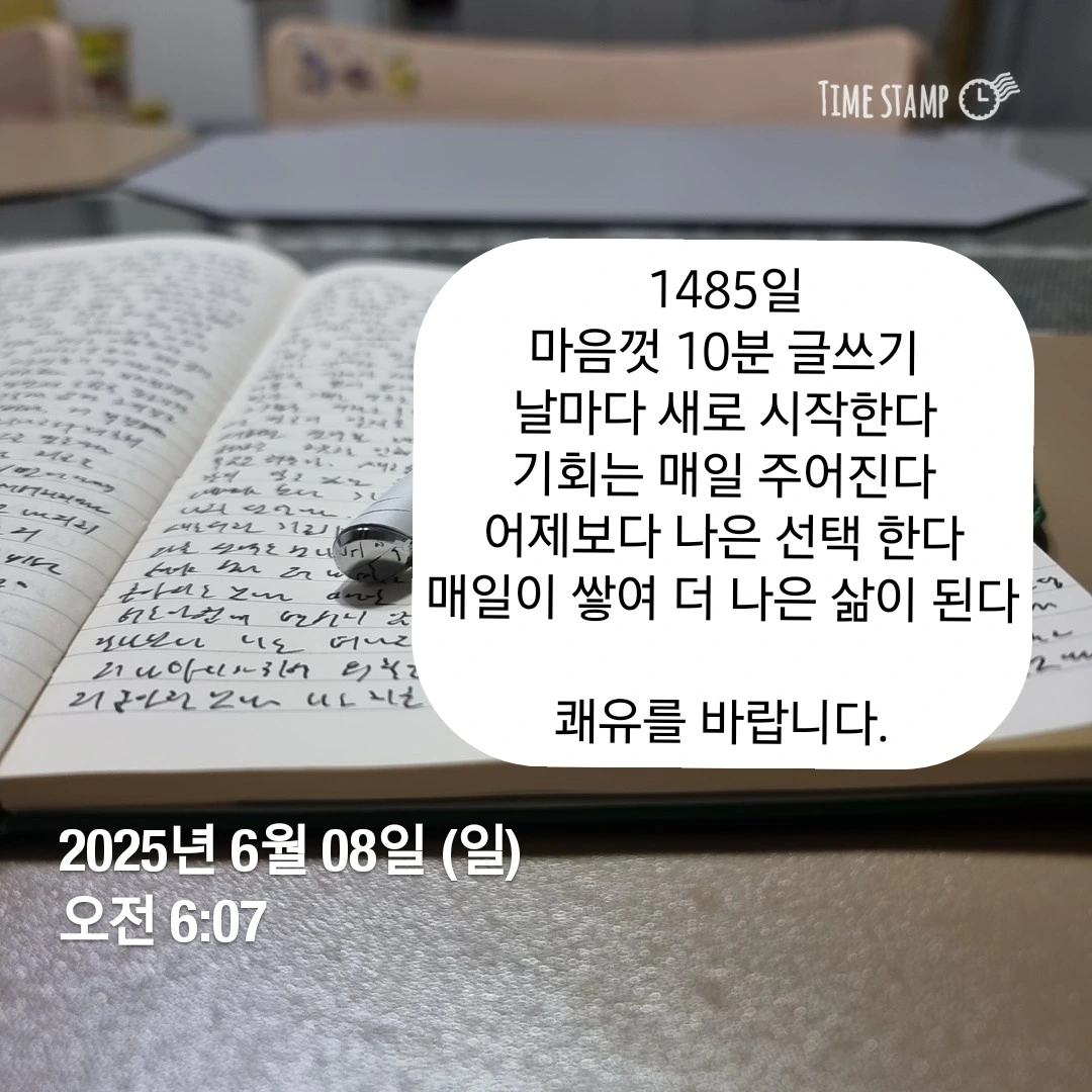 누구에게나 새로 시작할 기회가 주어집니다. 그 기회를 알아차리는 건 각자 몫입니다. 그 기회를 살리는 것도 각자 선택입니다. 어떤 선택을 내리느냐에 따라 오늘 나는 달라질 수 있습니다. 오늘이 달라지면 조금 더 나은 내일을 기대할 수 있습니다. 더 나은 내일을 위해 오늘 이 순간을 글 쓰기를 선택했습니다.