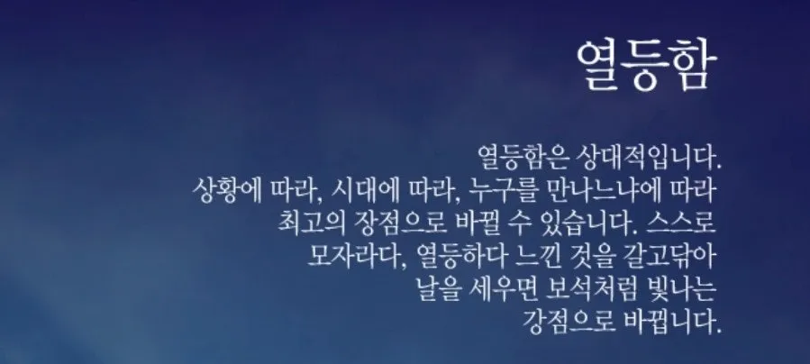 열등감은 동기부여로 활용할 수 있습니다. 잘만 활용하면 언제 어떤 상황에서도 자기를 일으켜 세우는 역할을 해줄 테니까요. 문제는 열등감이라는 감정은 통제가 쉽지 않다는 데 있습니다. 우리 대부분은 감정을 완벽하게 통제하지 못하기 때문이죠. 살면서 느끼는 수많은 감정 중 하나가 열등감이기도 합니다. 자칫 이 감정을 통제하지 못하면 잘못된 선택을 하게 될 수도 있습니다. 경쟁에서 옳지 못한 방법으로 상대를 이기려는 짓을 하기도 하지요. 이기는 그 순간은 짜릿할 겁니다. 하지만 그 기쁨은 오래가지 못합니다. 자기도 똑같이 당할 수 있고, 옳지 못한 방법이 탄로 날 수도 있을 테니까요. 세상사 새옹지마라고 했습니다. 모든 건 돌고 돌아 결국 제자리를 찾죠.