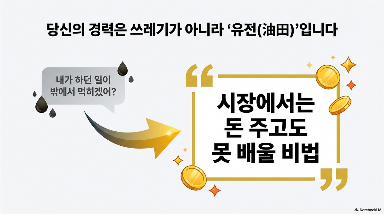 이것은 시장을 전혀 모르는 소리입니다. 당신이 매일 수행하던 업무, 골치 아픈 문제를 해결하던 그 과정은 시장 밖에서 보기엔 강력한 '호기심 갭'을 유발하는 독보적인 노하우입니다. 당신의 경력은 유통기한 지난 쓰레기가 아니라, 아직 시추되지 않은 마르지 않는 '유전'입니다. 이제는 "내가 무엇을 했는가"라는 내부자의 시선이 아닌, "시장이 무엇을 갈망하는가"라는 외부 시장의 관점에서 당신의 능력을 재정의해야 합니다.