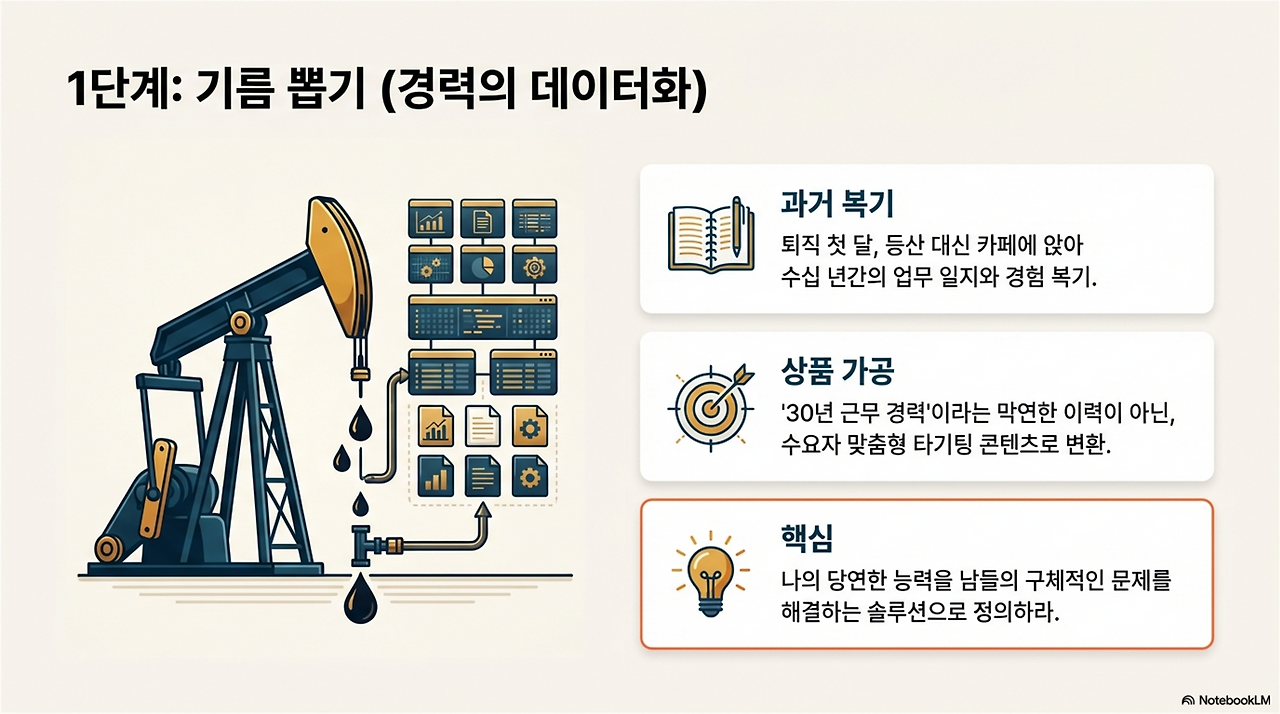 막연한 30년 경력을 현금으로 바꾸는 첫 번째 공정은 바로 '기름 뽑기', 즉 전략적 데이터화입니다. 시장은 당신의 '근속연수'에 돈을 지불하지 않습니다. 오직 당신이 제공하는 '결과(Outcome)'에만 지갑을 엽니다.