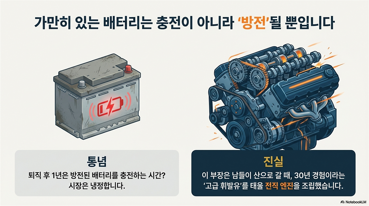 배가 아프신가요? 하지만 이것은 운이 좋아서 생긴 마법이 아닙니다. 대부분의 퇴직자가 1년이라는 시간을 '방전된 배터리를 충전하는 시간'이라 착각할 때, 이 부장은 냉혹한 시장의 진실을 직시했을 뿐입니다. 가만히 있는 배터리는 충전되는 게 아니라 '방전'됩니다. 당신이 쉬는 사이 당신의 기술은 낡아가고, 업계는 당신을 잊습니다. 이 부장은 산으로 가는 대신 자신의 30년 경험이라는 '고급 휘발유'를 태워줄 새로운 엔진을 조립하고 있었습니다.