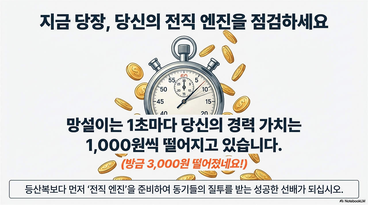 베테랑 컨설턴트로서 뼈 때리는 조언 하나 드리겠습니다. 지금 이 글을 읽으며 망설이는 1초마다 당신의 경력 가치는 정확히 1,000원씩 떨어지고 있습니다. (방금 문장을 읽는 사이에도 3,000원이 증발했습니다!) 시장에서 당신의 현역 시절 노하우가 '신선도'를 유지하며 먹히는 골든타임은 생각보다 짧습니다.