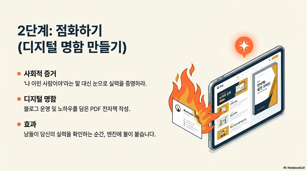 말로만 전문가라고 주장하는 시대는 끝났습니다. 당신의 실력을 입증할 '사회적 증거(Social Proof)'가 필요합니다. 거창한 단행본을 쓸 필요도 없습니다. 당신의 노하우를 압축한 20페이지 내외의 PDF 전자책이면 충분합니다. 이 20페이지는 당신을 '그냥 퇴직자'에서 '돈 주고 모셔야 할 솔루션 제공자'로 즉각 격상시키는 강력한 디지털 명함이 됩니다. 심리적 장벽을 낮추십시오. 20페이지의 전문성이 당신의 엔진에 불을 붙입니다.