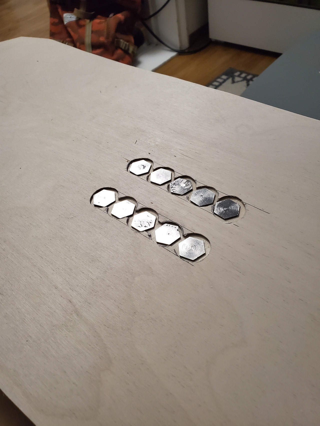 따라서 합판코어도 정확한 재단 없이, 다만 인서트의 위치만 신경써서 체크해주었다. 그리고 평비트를 사용하는 트리머를 이용하여 단차 가공을 해주고, 인서트를 삽입하였다.
