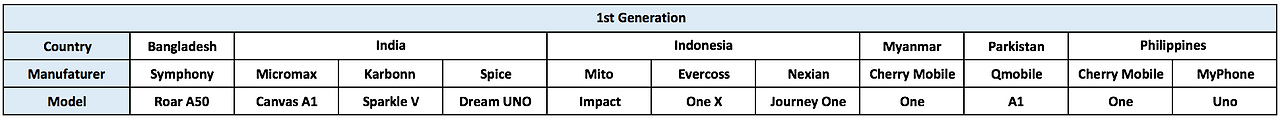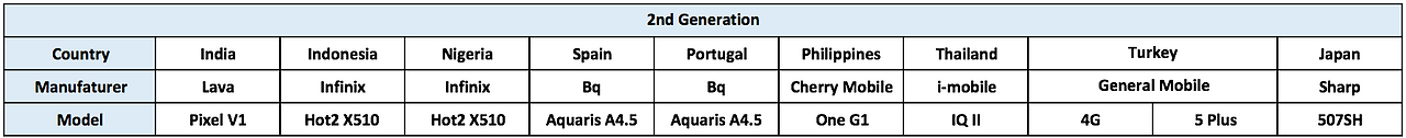 어쩌면 중국의 여러 ODM 업체를 이용해 각각의 지역에 있는 Distributor의 이름을 빌어 제품을 출시했다고 보는 게 맞을 거 같다. 그리고 2015년에 들어서서는 2세대 제품을 출시하면서 기존 미디어텍뿐만 아니라 퀄컴까지 협력을 확대하였고 출시 지역 역시 기존 인도와 필리핀, 인도네시아와 같은 동남아시아에서 나이지리아와 같은 아프리카, 스페인, 포르투갈과 같은 서유럽, 그리고 터키와 일본 같은 지역으로 확대하고 있다.