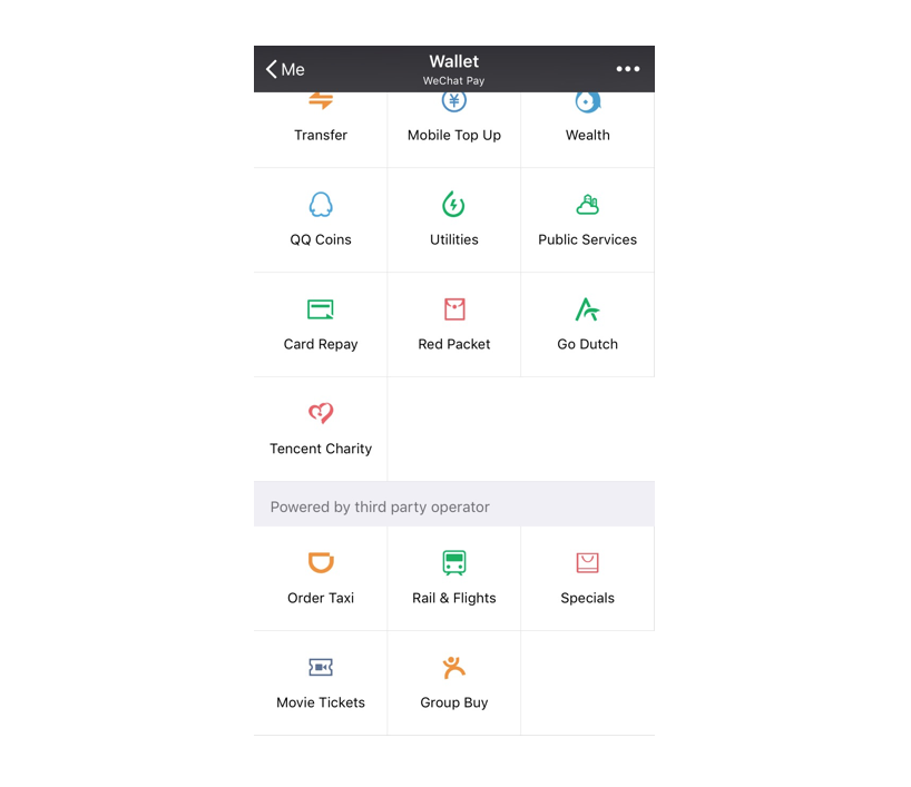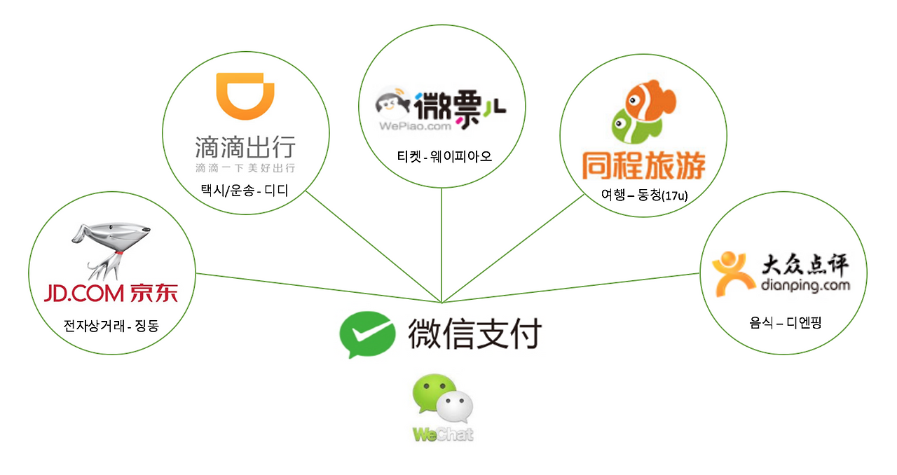 2015년 기준으로 중국의 대표적 페이먼트 서비스인 알리페이와 위챗 페이의 시장 점유율은 73%와 17% 수준으로 두 회사를 합치면 거의 90%에 육박한다. 알리바바의 경우, 결재 과정이 필수적인 전자 상거래를 기반했기 때문에 페이먼트 시장 점유율을 늘리기 쉬운 구조였다. 하지만, 위챗의 경우, 전자 상거래를 통한 페이먼트 서비스 가입자를 늘리기 위한 수단이 없었다. 텐센트는 이런 위챗의 약점을 너무나 잘 알고 있었다. 그리고 위챗의 강점이 어떤 부분인지도 정확히 알고 있었다. 바로 10억에 가까운 가입자와 6억에 육박하는 월평균 유저(MAU)였다. 1.8억 정도로 추산되는 카카오의 가입자 수와 비교해도 위챗의 이런 숫자는 엄청난 잠재력을 가지고 있다고 볼 수 있다. 그리고 텐센트는 이런 위챗의 잠재력을 최대한 활용해야 했다. 바로 O2O 플랫폼으로의 변신이 그것이었다. 알리바바와 같은 전자상거래 업체인 징동과의 제휴, 디디나 디엔펑과 같은 O2O업체에 대하 지분 투자 또는 인수를 통한 서비스의 확장은 기존 생활 밀착형인 메신저 서비스의 기능을 강화하고 확장하는 역할을 충분히 하고 있다. 또한, 위챗을 사용하는 가입자가 자연스럽게 위챗과 연결돼 있는 서비스를 이용하고 거기서 발생하는 지불을 위챗 페이로 연동해 처리하는 부분은 텐센트나 나머지 다른 써드 업체에게도 장점으로 작용하고 있다.