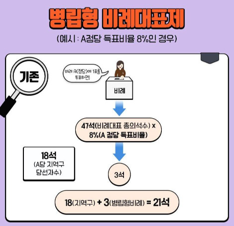 병립형 + 연동형이 함께 적용되는 방식이라고 할 수 있어. 이번 21대 국회의원 선거에 활용되는데