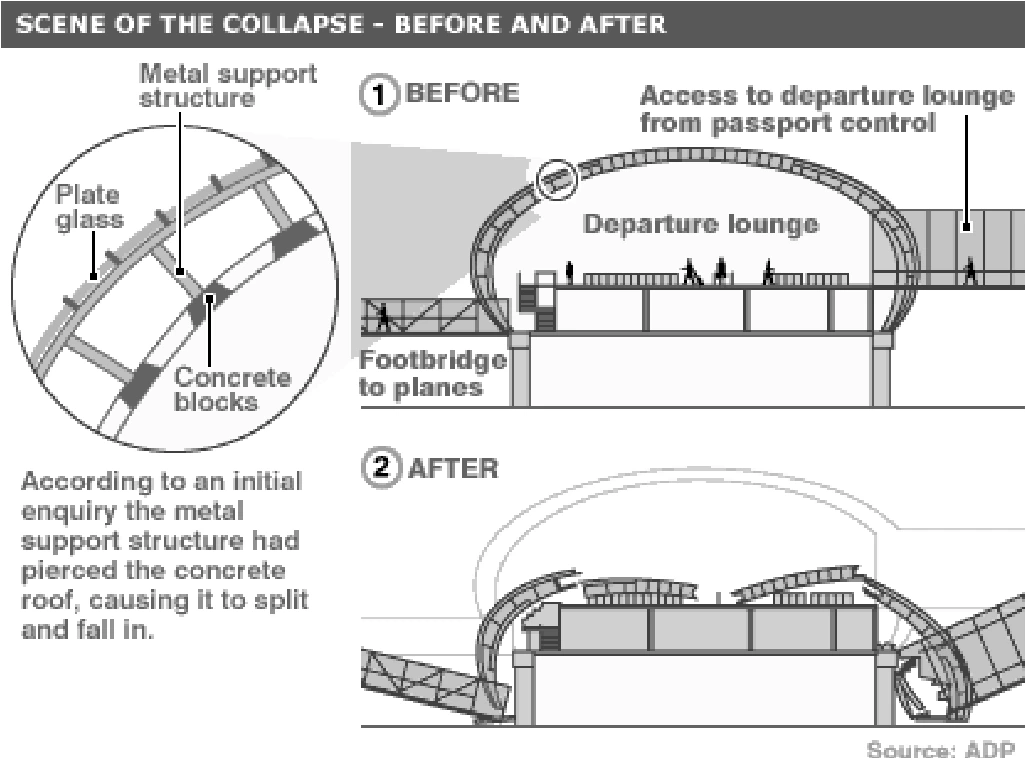 샤를 드골 공항의 제 2E 터미널은 현대 건축의 미학을 극대화한 대표적 사례로 평가받았다. 특히 내부 기둥이 없이 원통형으로 설계된 구조는 건축적 아름다움과 개방감을 극대화했다는 평가를 받았으며, 이를 가능케 한 것은 첨단 건축기술이었다. 그러나 구조의 아름다움과 혁신성이 반드시 구조적 안정성을 보장하지 않는다는 사실을 충분히 고려하지 못했다. 긴급한 일정과 기술적 검증의 부족으로 인해 설계의 치명적인 허점이 간과된 것이다.