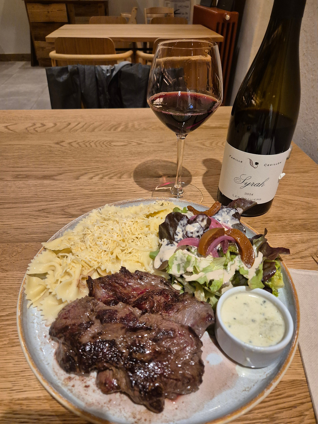 첫날의 저녁메뉴는 스테이크다! 파스타와 샐러드, 고트치즈소스를 곁들인 스테이크에 현지산으로 보이는 쉬라품종 와인을 페어링했다.