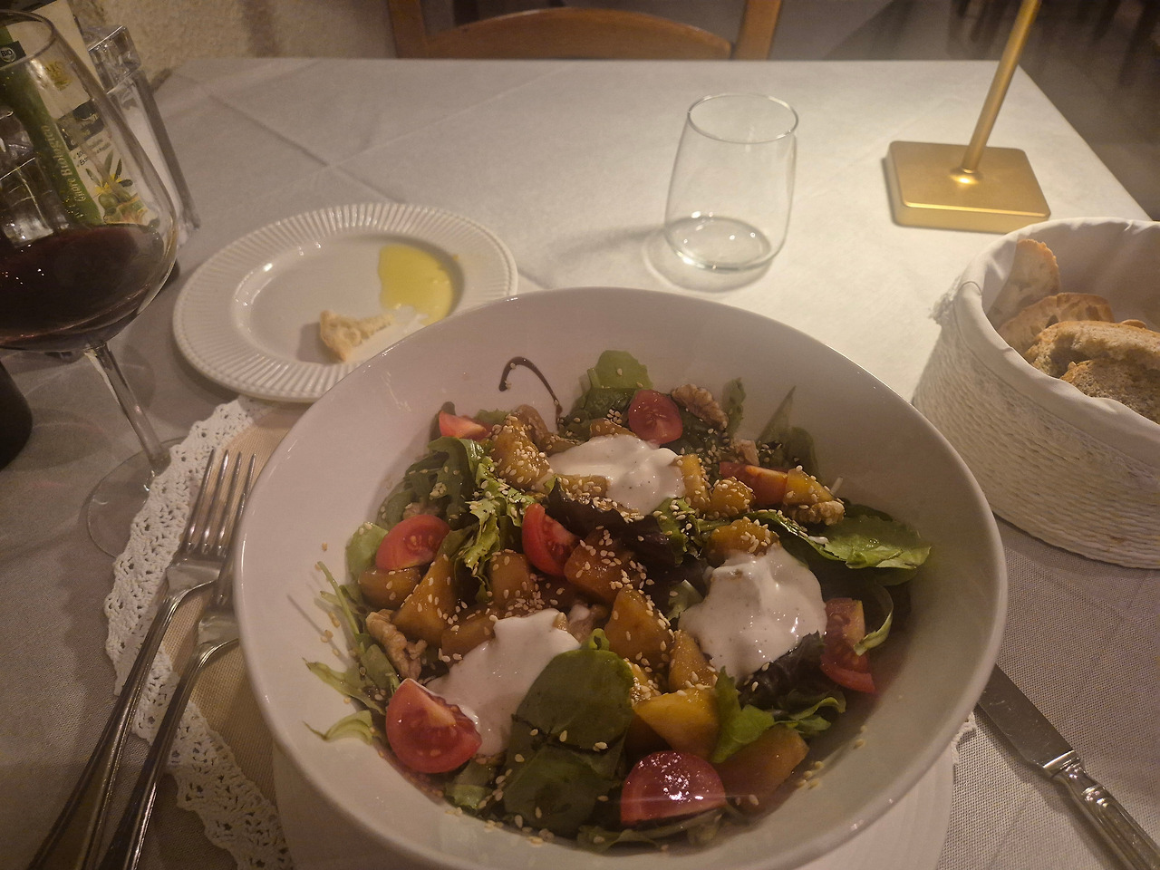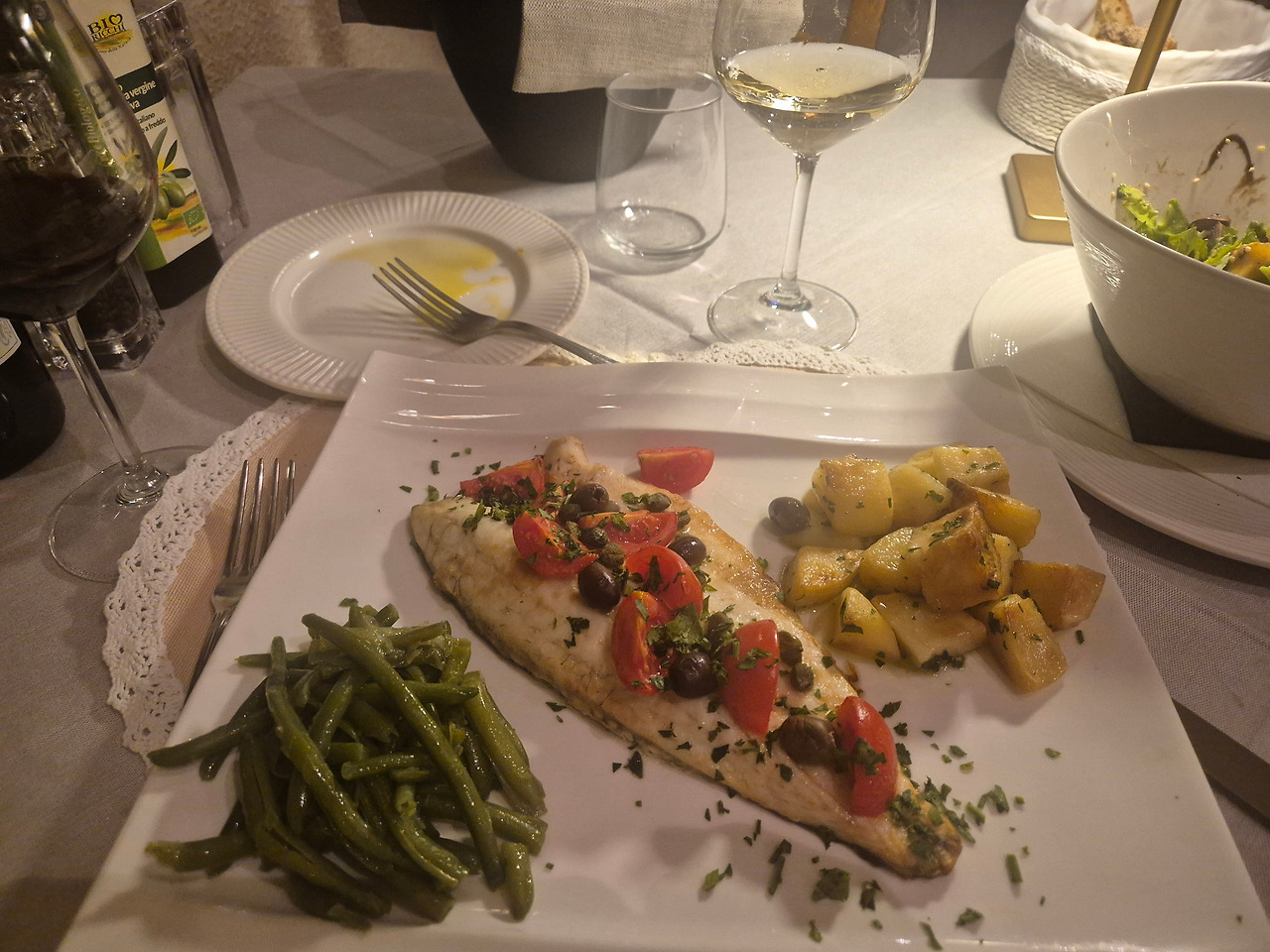 오늘의 메뉴는 주방특선 샐러드와 Sea Bass! 농어다. 특선샐러드에는 구운 사과와 크림소스를 토핑했다. 구운 사과의 녹진한 단맛과 소스의 크리미함이 묵직한 몬테풀치아노와 아주 잘 어울렸다.