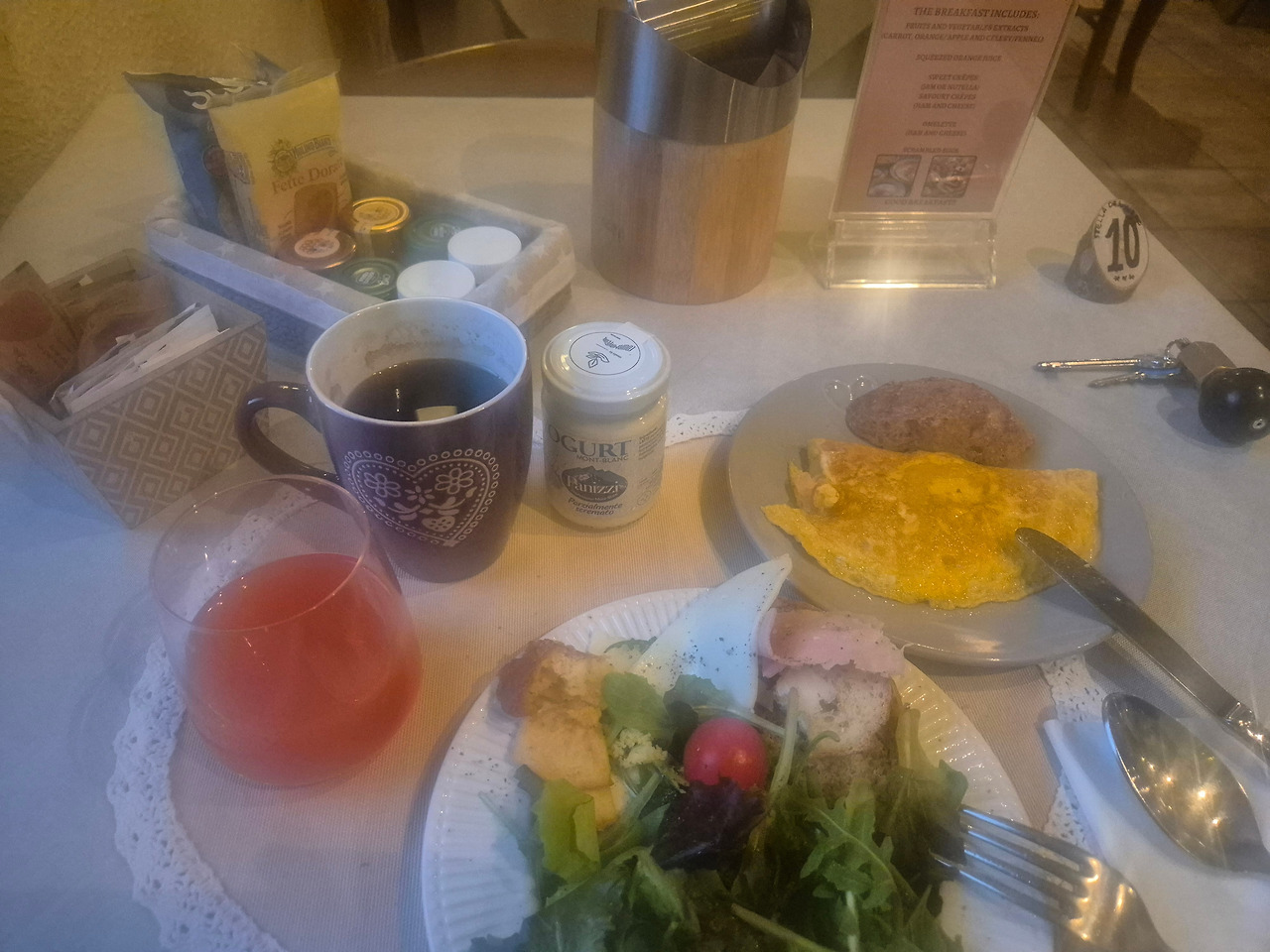 햄, 치즈, 요거트, 착즙쥬스, 바게트, 파이류, 샐러드, 잼, 버터 등 구성이 풍성하다. 취향에 따라 아주 건강하게, 혹은 아주 푸짐하게 먹을 수 있다. 오믈렛, 스크램블에그 같은 핫디쉬는 주문 즉시 만들어준다. 흔한 조식 같지만, 하나하나 정성과 따뜻함이 느껴졌다.