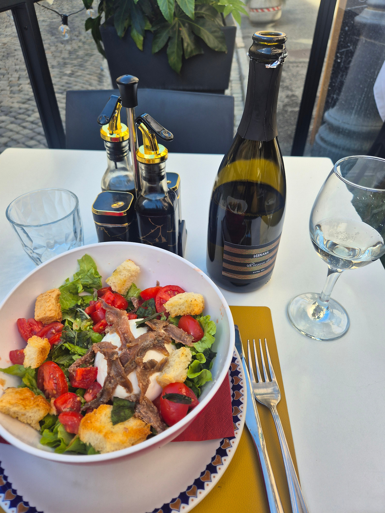 오후 2시. 시간은 애매했지만, 다시 올지 모르는 이곳에서 반드시 미식 경험을 해야 한다고 세포들이 속삭였다. 지나가면서 눈여겨본 노천카페의 테라스 자리에 앉아 프로세코와 지중해식 샐러드를 주문했다. 앤쵸비와 부라타치즈의 고소한 짭짤함이 입안에 착 감긴 뒤, 프로세코의 미세한 탄산과 청명한 산도가 혀를 산뜻하게 정리해준다. 특별할 건 없는 메뉴지만, 그곳에서만 느낄 수 있는 감흥이 있다.