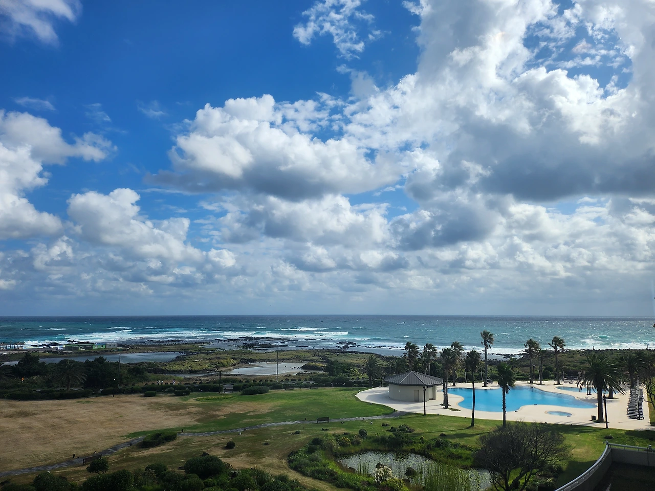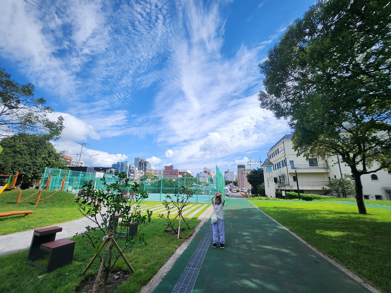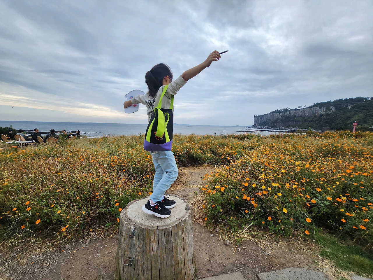 네 번째쯤 연달아 제주도를 가다 보니, 유명하다는 곳을 찾아 굳이 가지 않게 됐다. 그저 절벽이 아름다운 카페에서 반나절을 보내고, 그곳에서 처음 보는 노란 코스모스와도 사랑에 푹 빠졌다. 특이한 건축 양식을 가진 도서관에서도 반나절을 보냈다. 그 도서관 위에 펼쳐진 가을 하늘의 아름다움은, 제주도 어느 책에도 없는 절경이었다. 이런 외진 곳에 누가 책을 사러올까 싶은 곳에, 서점과 카페와 교회가 함께 있었다. 얼굴이 잘 생각나지 않는 선배와 뒤늦게 목회자가 된 남편분이 일군 공간이었다. 거기 사는 4인 가족이 퍽 부러워진 제제와 수수는 그곳에 사는 아이들처럼, 자연속에 자주 있고 싶다고 말했다. 섭지코지를 보러 가려다가, 낮잠을 자버려서, 뒤늦게 깜깜한 어둠 속에서 본 일몰 광경 역시 잊지 못할 추억이 되었다. 공주 침대에서 꼭 자야한다는 수수의 제안대로, 여태 가보지 못한 제주의 남동쪽으로 가다 보니, 아이들이 너무나 좋아하는 놀이터들이 많았다. 고구마와 어묵을 무한대로 준다는 호텔 수영장을 기대하며 가보니, 수영 장에서 제공하는 뜨끈뜨끈한 치킨 한 마리가 기다리고 있었는데, 그 맛이 일품이었다.