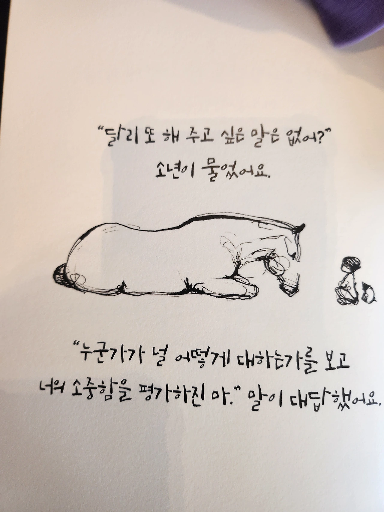 “제이야 안녕!” 제이는 언제나처럼 대답이 없다. “............” “제이야 잘가!” 앞서 걸어가던 제제가 제이를 혼자 부르고, 혼자 인사를 하고, 멀어진다. 나는 또 제제에게 간섭이 하고싶어지고, 화도 나기 시작했다. 이제는 나 자신을 위해서라도, 이런 일에, 나의 소중한 에너지를 쓰지 않아야 하는데 말이다.