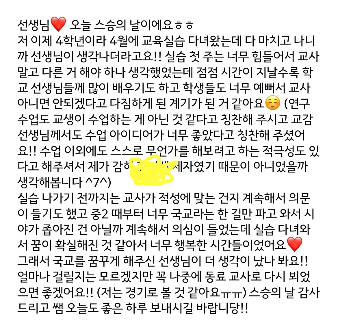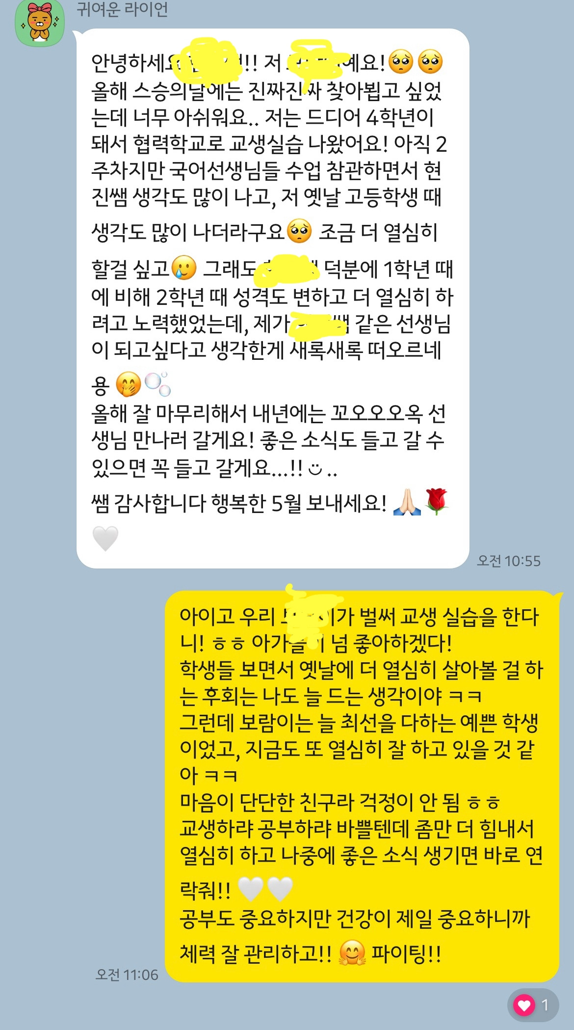 안그래도 번아웃이 와있는데, 이런 저런 흉흉한 이야기들로 자긍심을 잃어가는 나에게 오늘 무려 십 년 전의 제자부터 시작해, 내 덕분에 교사의 꿈을 갖게 되었다고 말해주는, 그리고 나보다 열심히, 훌륭히 교사의 꿈을 이루기 위해 공부하고 있는 아이들에게 연락이 왔다. 스승의 날이란 이런 날인거구나.