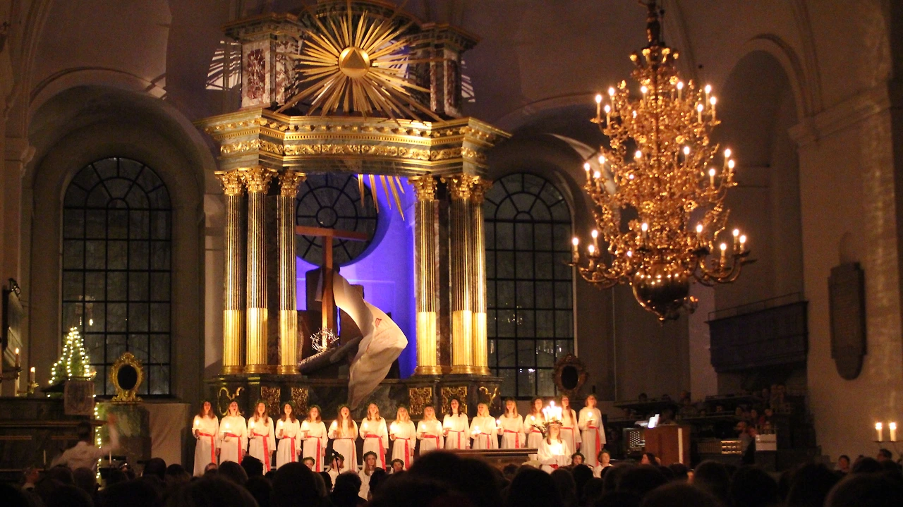 우선 루씨아는 성녀로 시칠리아에서 태어나 304년에 순교한 성녀이다. 그녀의 이름은 Lux(빛)에서 비롯되었다고 한다. 그녀의 아버지는 일찍 돌아가시고 병든 어머니가 있었는데, 그녀의 간절한 기도로 어머니가 병이 치료된 후 그녀는 동정녀가 되어 어려운 사람들을 돕는 삶을 살기로 다짐했다고 한다. 그래서 그녀는 로마의 지하동굴에서 박해당하는 기독교인들에게 음식을 나눠주곤 했다. 그때 양 손에 먹을 것을 지니기 위해 머리에 촛불 왕관을 쓰고 다녔다고 한다. 하지만 그녀는 이미 약혼자가 있었고 그는 그녀가 그리스도인임을 받아들이지 못했고 그녀가 기독교인임을 고발해버렸다. 그렇게 루씨아는 감옥에 갇혀 많은 고문을 받으며 기독교 신앙을 버리도록 강요받았고, 심지어는 눈알을 뽑히는 형벌을 받았다고 전해진다. 하지만 천사들이 성녀의 뽑힌 눈알을 돌려주고 그녀의 몸이 무겁게 되어 매음굴로 보내지지 않도록 보호하였다. 결국 그녀는 장작에 둘러싸이고 불에 붙여졌지만 타지 않았고, 칼에 찔려 순교하였다고 한다.