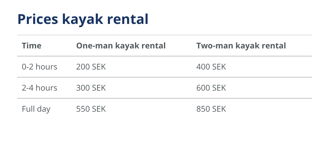카약을 빌리는 비용은 다음과 같다. ( 2017년 9월 11일 기준 환율은 1 sek = 140 won이다.)