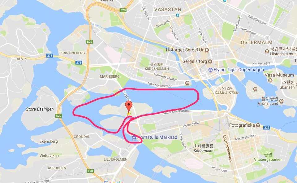 홈페이지를 보면 카약을 타고 구경하는 추천 경로가 제시되어 있다. 아래 경로는 내가 카약을 탄 경로이다. 우선 파도가 많이 치치 않는 hornstull 벼룩시장 쪽으로 가서 내가 카약을 잘 패들링 할 수 있는지 확인한 후 시청과 감라스탄이 보이는 곳으로 갔다.