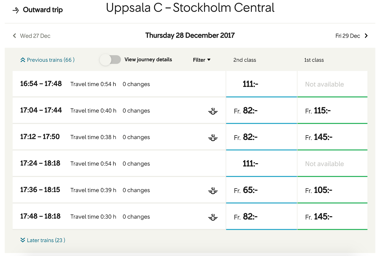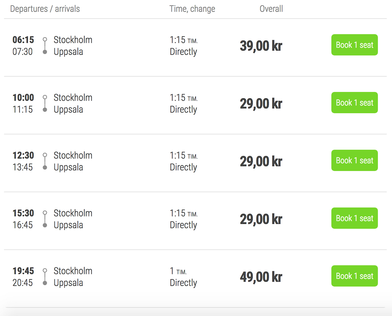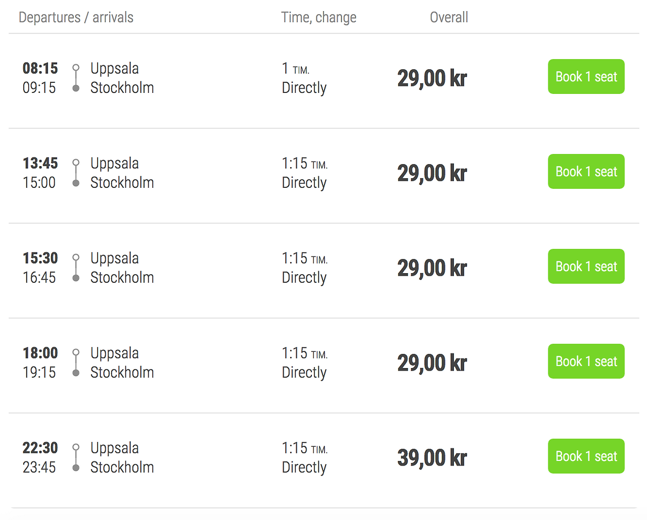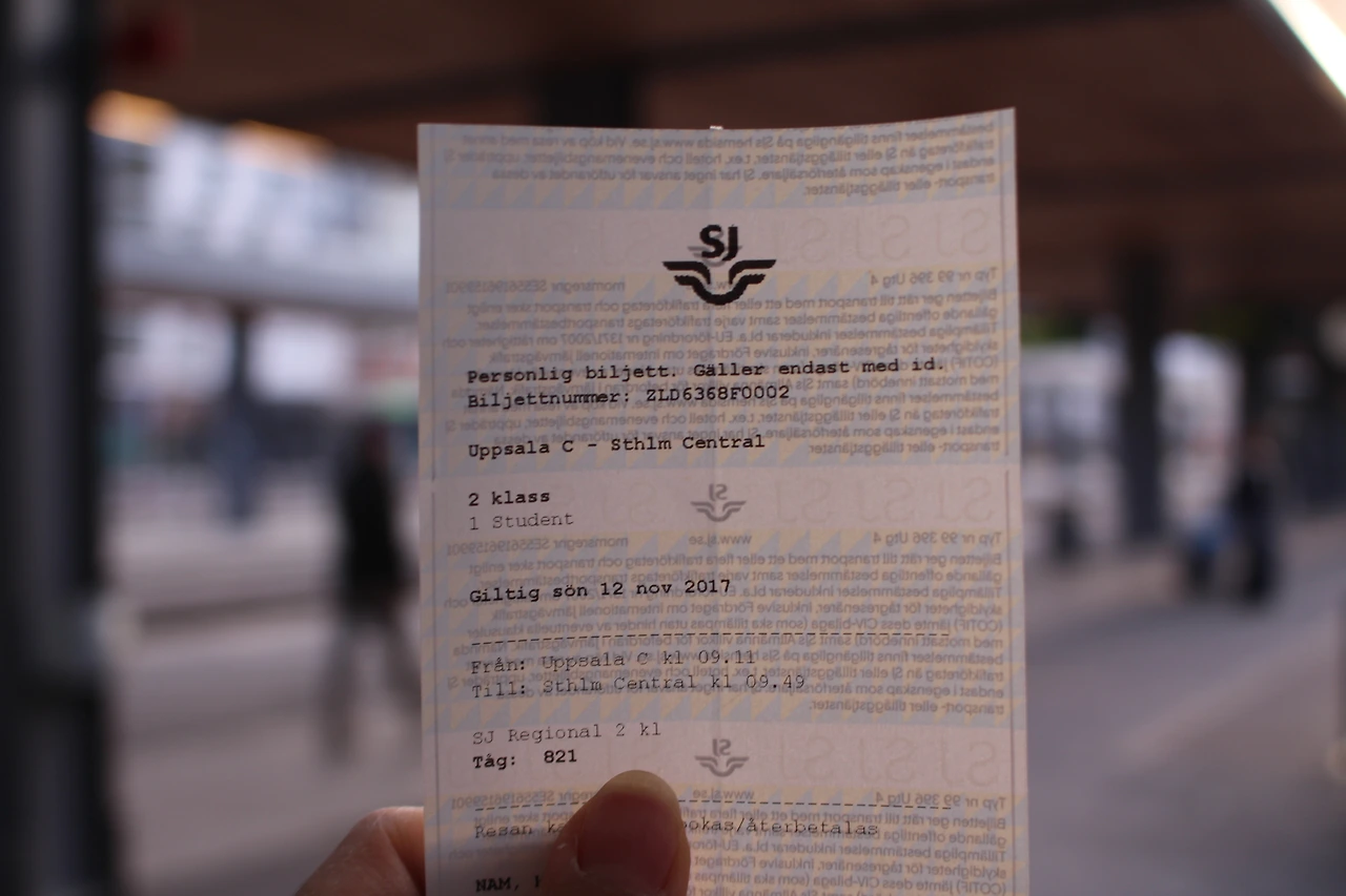 티켓은 역 안의 기계, 홈페이지, 어플을 통해 살 수 있고 가격은 세 방법 모두 동일하다. 아래의 사진에는 홈페이지를 통해 웁살라에서 스톡홀름으로 가는 시간표와 가격이 나와있다. 기차는 10분의 한대 정도 있고 기차마다 소요시간과 가격이 모두 상이하다.