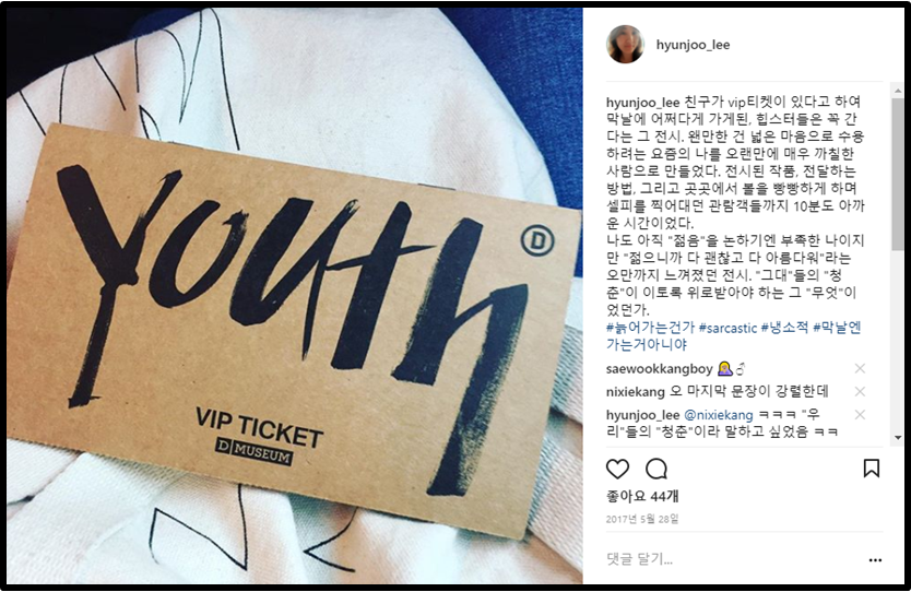 하지만, 왜 전시마저 그렇게 되어야 하는 것일까. 디뮤지엄의 'YOUTH' 전시 마지막 날은 마치 아직까지 인증샷을 찍지 못한 "힙스터" 따라쟁이들이 마지막 기회를 부여잡듯이 모두 모인 것만 같았다. 너무 화가 난 나머지 그들은 과연 어떤 감상을 자신의 SNS에 남길까 해서 #디뮤지엄 해시태그를 검색해서 찾아보기까지 했었다. 슬프게도 제대로 된 감상평을 남긴 사람들은 찾지 못했다. 대부분 '예쁘다', '좋다' 정도의 짧은 형용사 정도. 간혹 자신을 위로하는 멘트 등이 있었고, 아마도 그것이 이 전시의 주제였겠지만, 20대를 예전에 지나 40대를 향해가가던 나는 '청춘 마케팅' 상술로 보이기까지 했다.