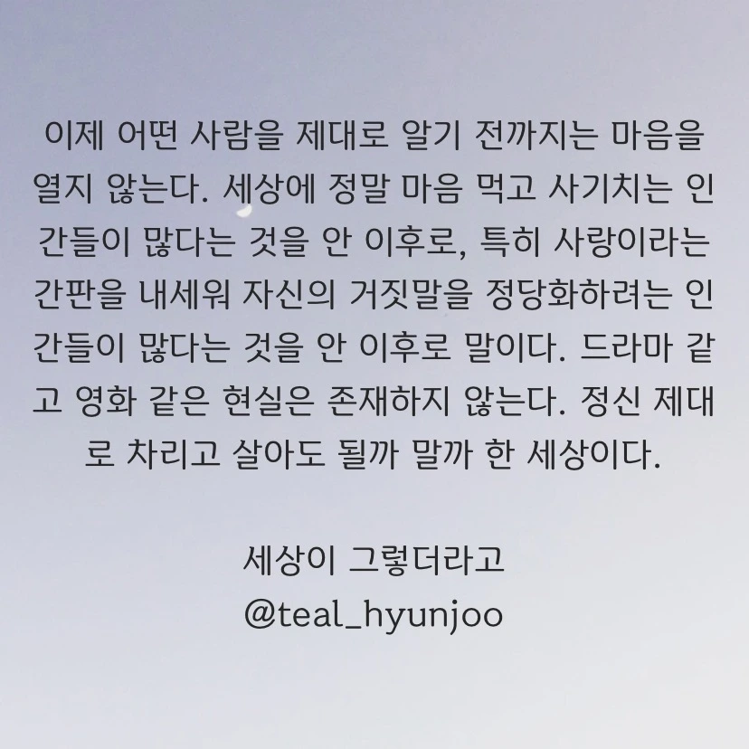 세상에 거짓말하는 사람들이 너무 많고, 사기치는 사람들이 너무 많다는 것을 어렸을 때부터 알았으면 행복했을까? 요즘엔 정말 모르겠는 일들이 참 많다. 산다는 건 참 별 일이더라.
