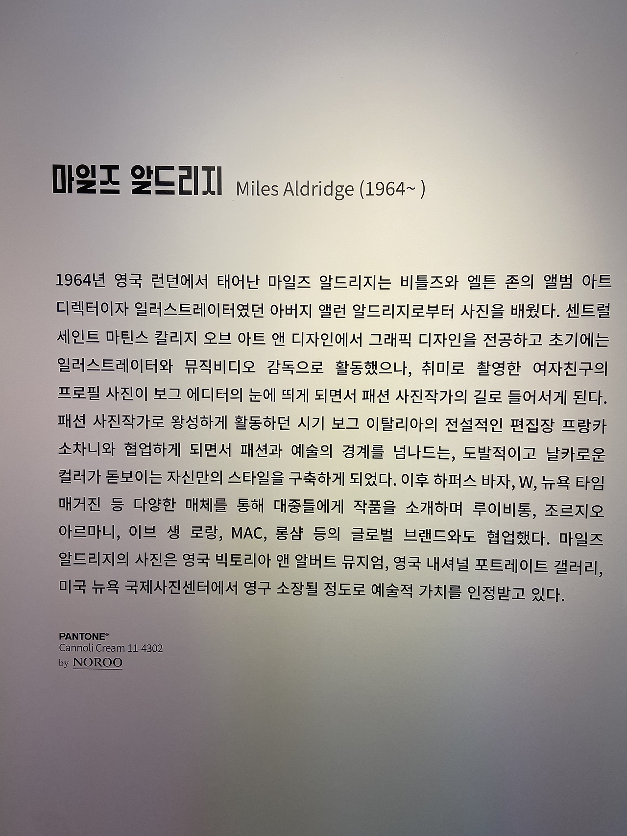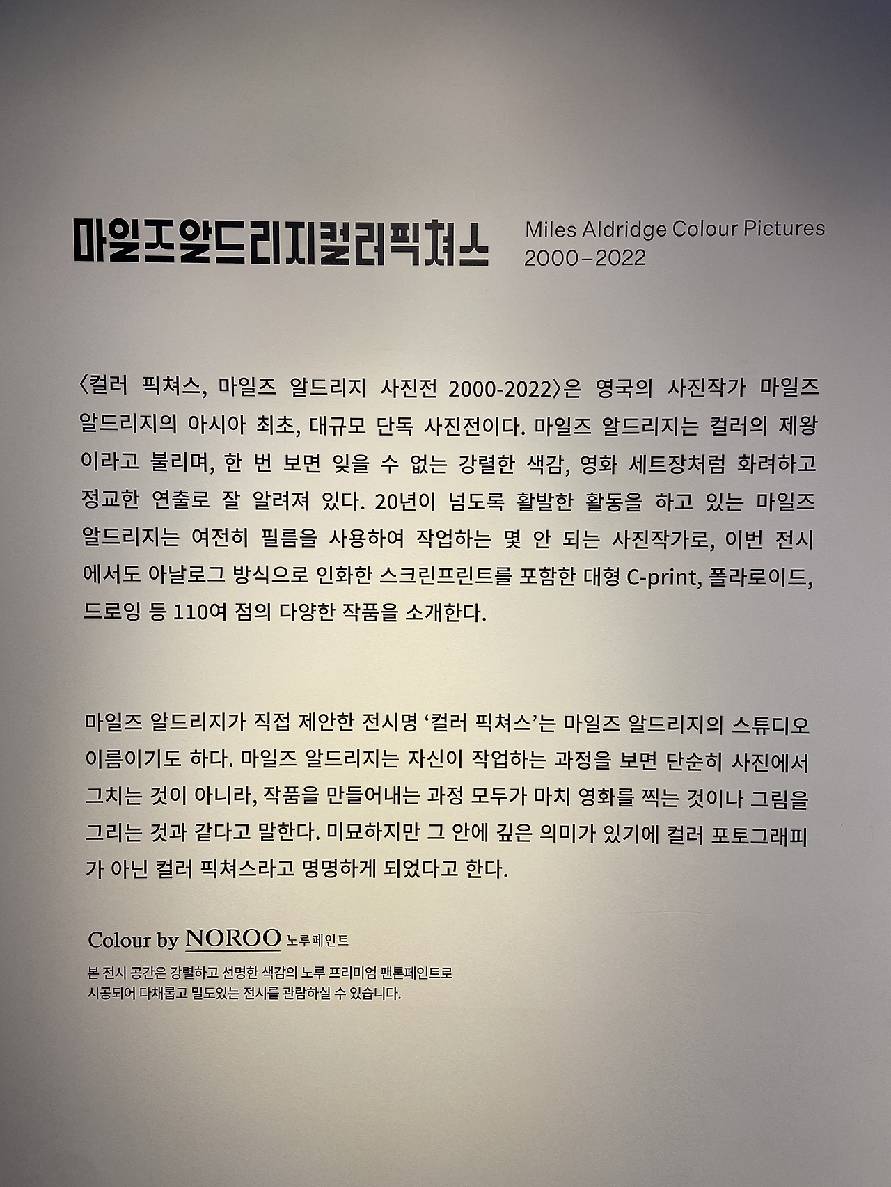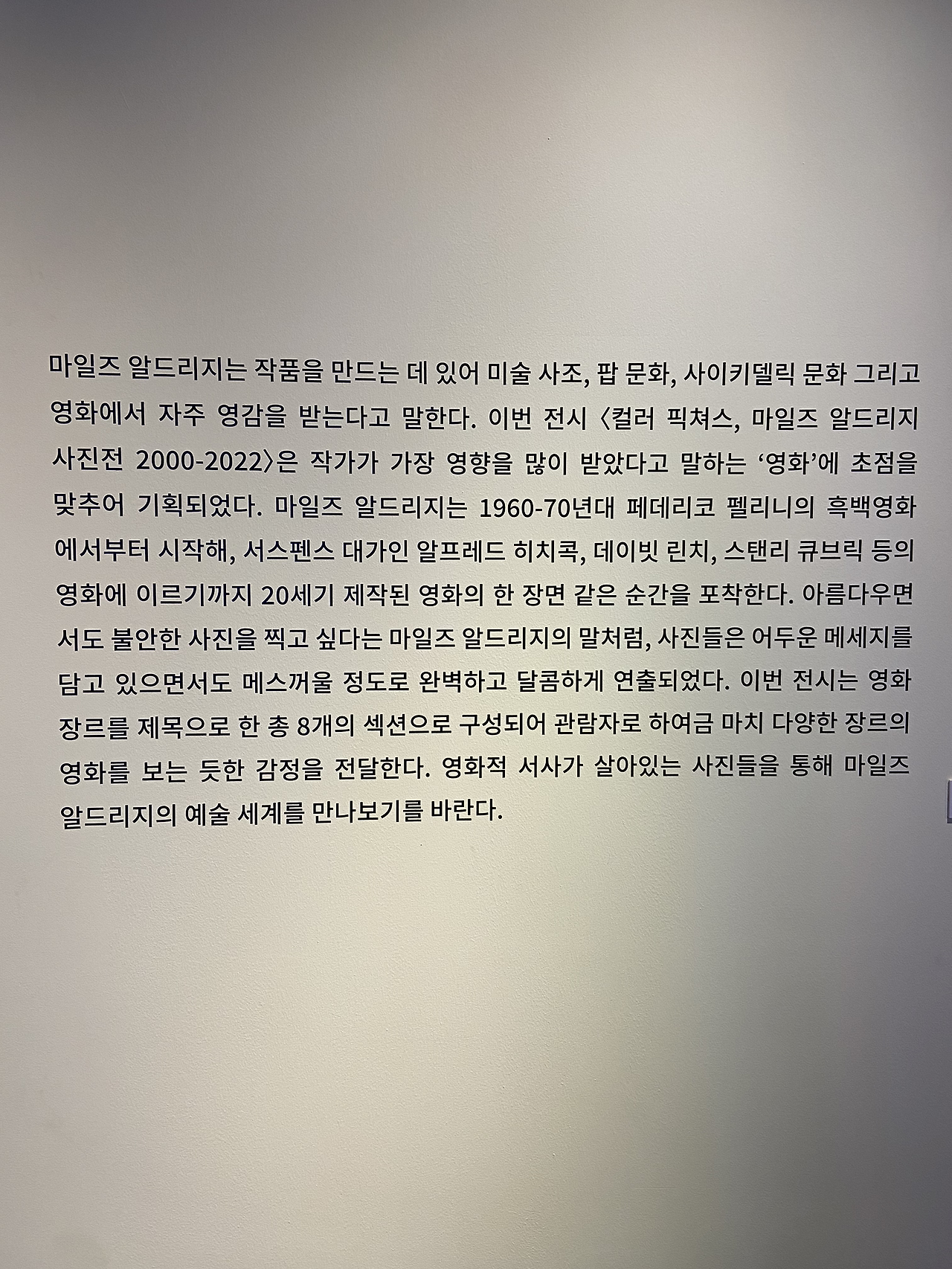 지난번에 본 앙리 마티스전에서도 그가 색과 색가의 충돌에 대해 이야기한 것이 인상 깊었었는데, 마일즈 알드리지의 사진들이 컬러를 인상적으로 사용하고 있는 것에 마음이 갔다. 결론을 미리 말하자면 너무 좋았던 전시였다.