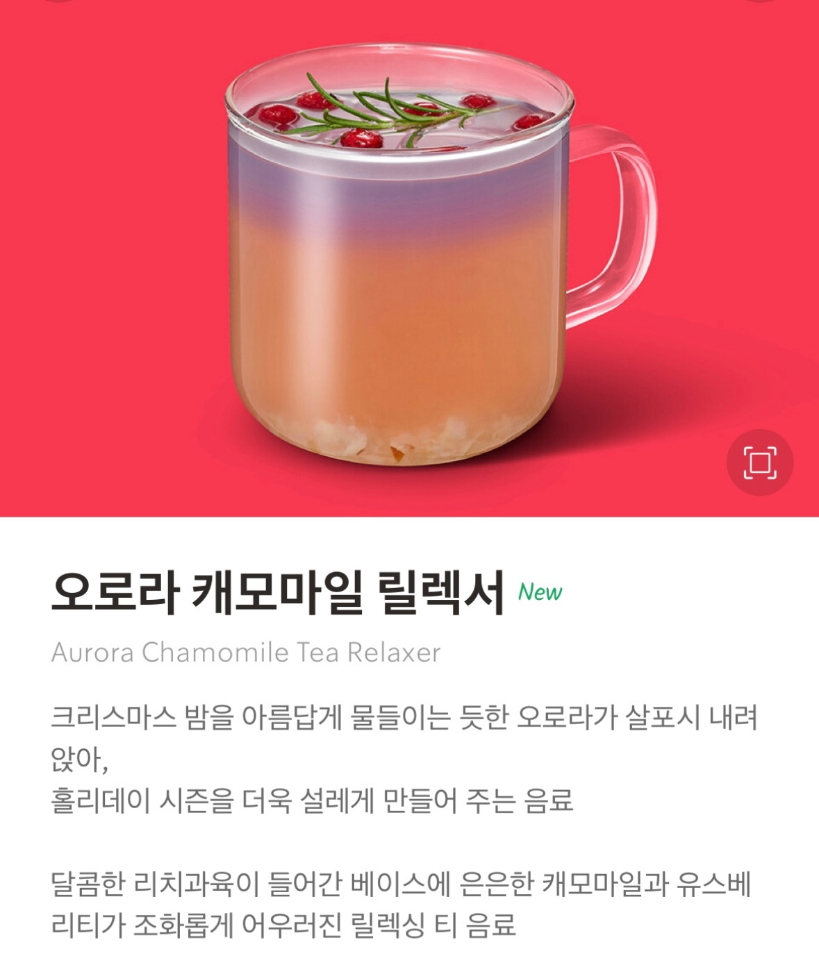 어제 남산에서 저녁을 먹고 쌀쌀해서 스벅에 가서 디카페인 커피를 마셨다. 아쉽게도 크리스마스 한정 음료인 캐모마일 릴랙서는 오늘부터라 어젠 못마셨고. 근데 이번에 오로라 릴랙서로 조금 바뀌었네?! 이따 들러야지~