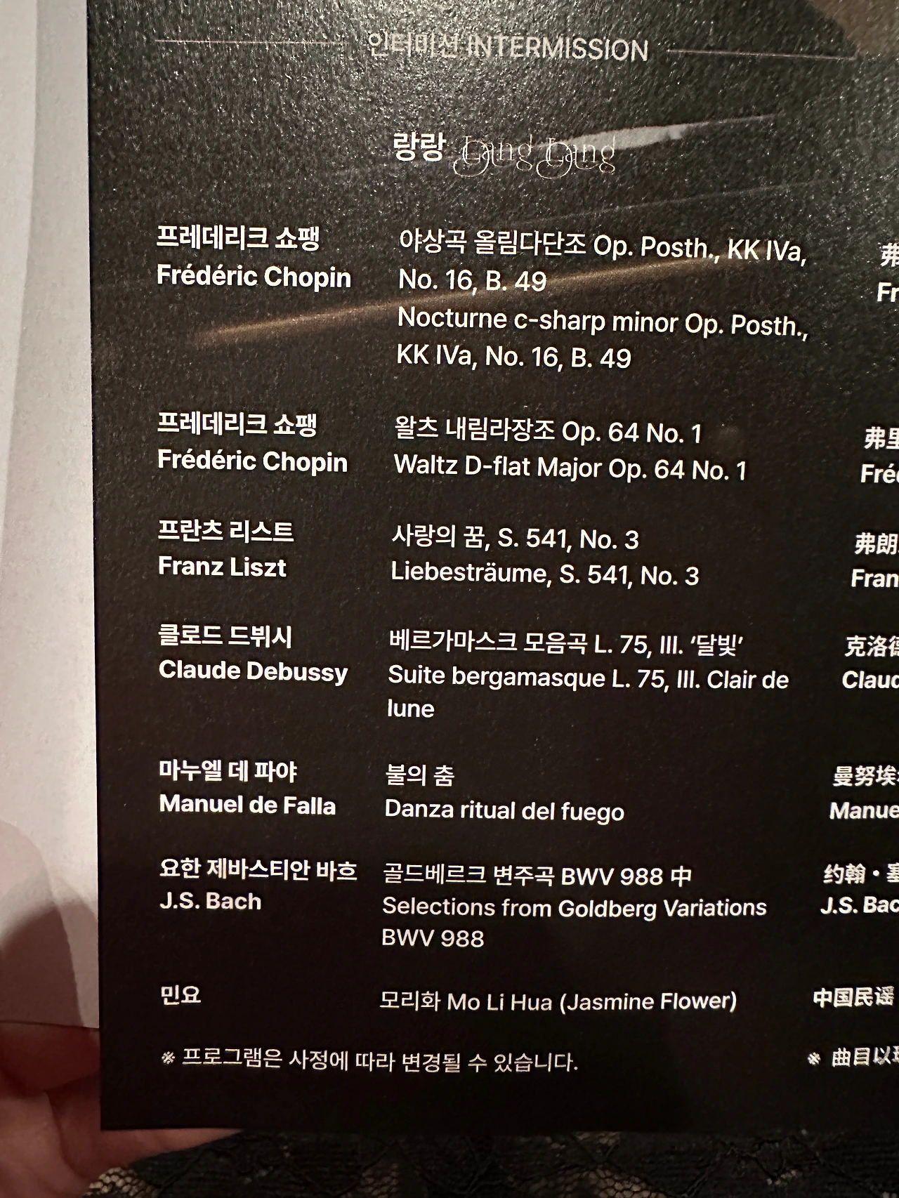 드뷔시 달빛 너무 좋았다구요. 이거 예권님 버젼으로 언제 듣냐고 ㅠㅠ 랑랑이 달빛 연주할 때 관크 있을까봐 엄청 긴장했는데 다행히 무난하게 넘어갔다. 그리고 중국 민요라는 모리화 (자스민꽃) 너무 좋았다고 한다 ㅎ