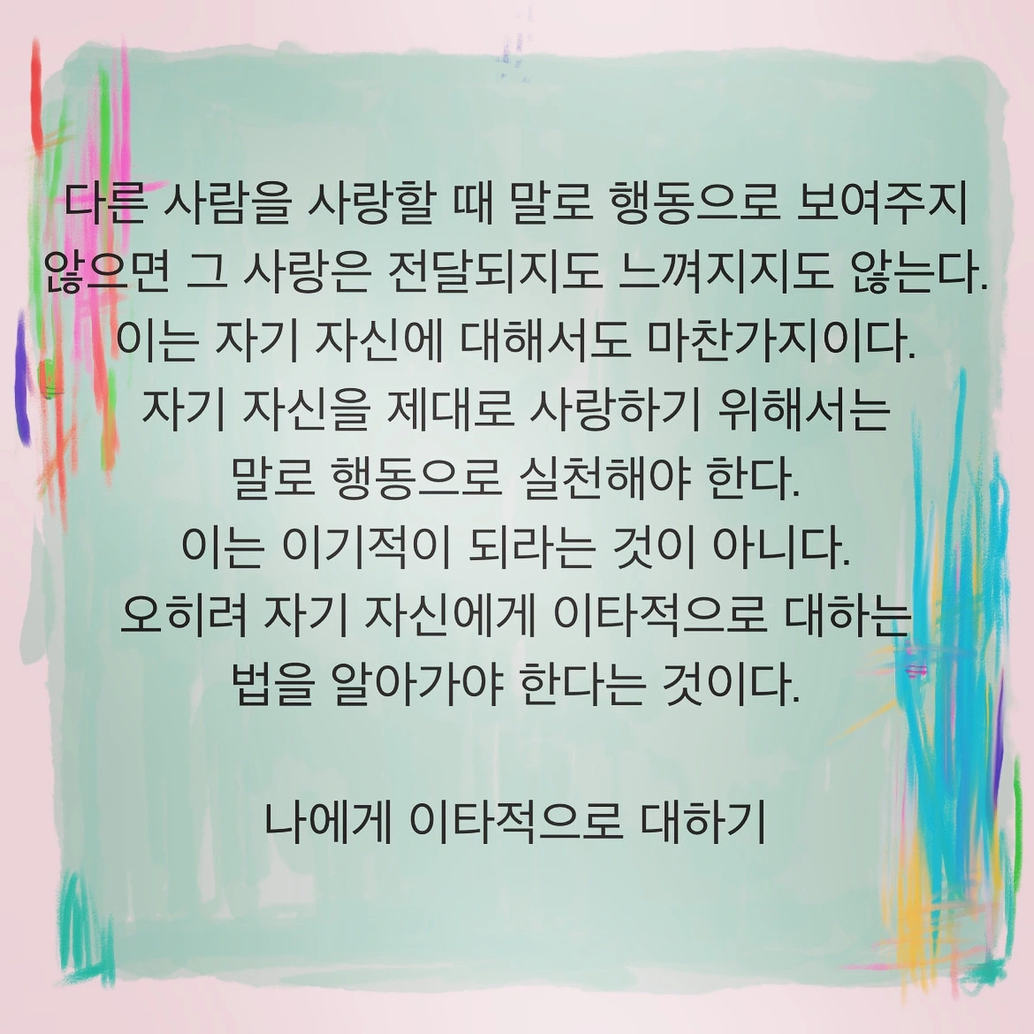 오히려 자기 자신을 제대로 사랑하는 방식은 이타적인 사랑에 가깝다. 도구적 사랑은 학대에 가까운 법이니 말이다.